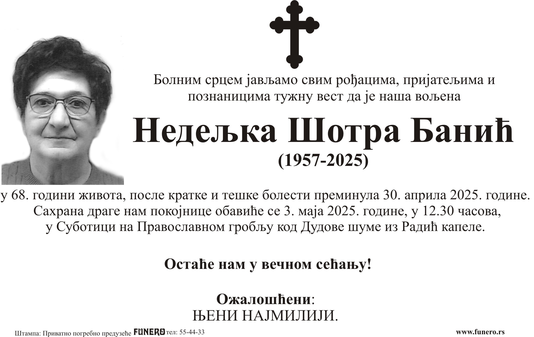 U 68. godini preminula je Nedeljka Šotra Banić iz Subotice, sa Aleje maršala Tita. Sahrana je 3. maja u 12 časova i 30 minuta na Pravoslavnom groblju kod Dudove šume iz Radić kapele.
