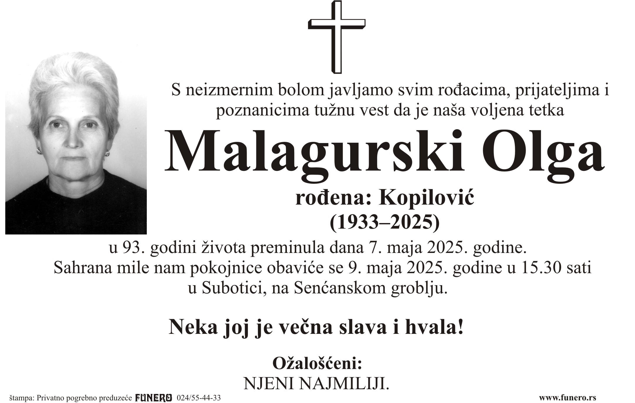 U 92. godini preminula je Olga Malagurski iz Subotice, iz ulice Ivana Milankovića. Sahrana je 9. maja u 15 sati i 30 minuta na Senćanskom groblju.