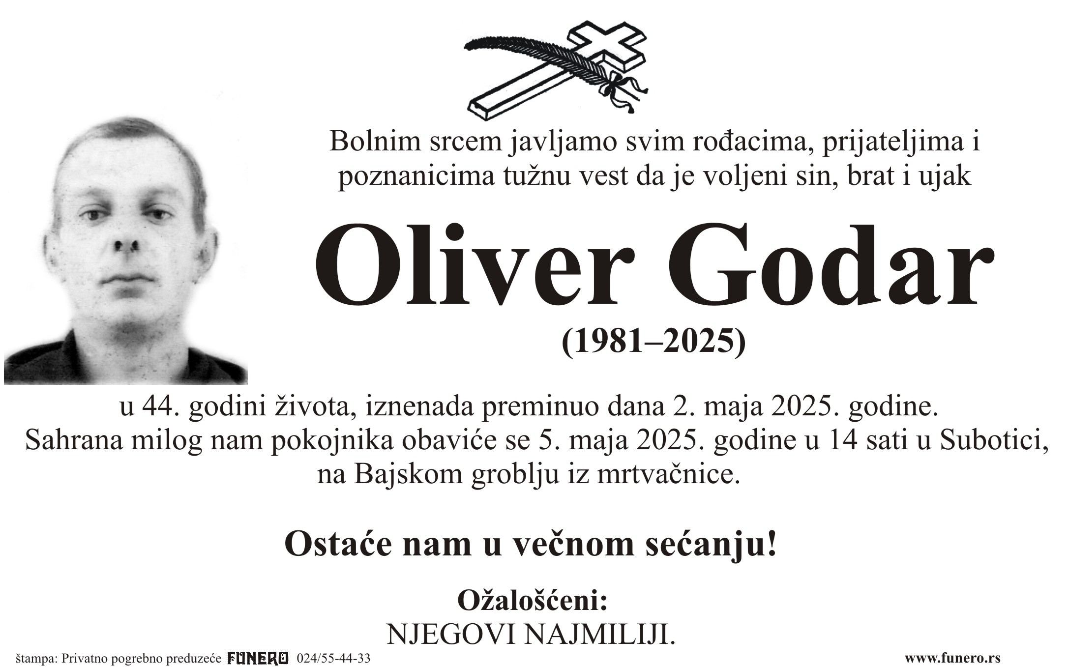 U 44. godini preminuo je Oliver Godar iz Subotice, iz Zorkine ulice. Sahrana je 5. maja u 14 sati na Bajskom groblju iz mrtvačnice.