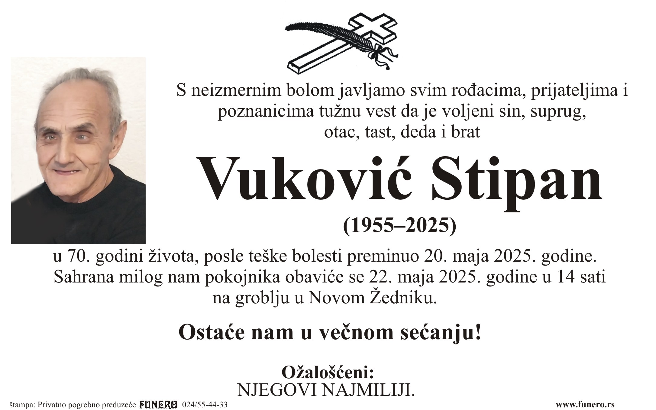 U 70. godini preminuo je Stipan Vuković iz Novog Žednika, iz ulice Petra Petrovića Njegoša. Sahrana je 22. maja u 14 sati na groblju u Novom Žedniku.