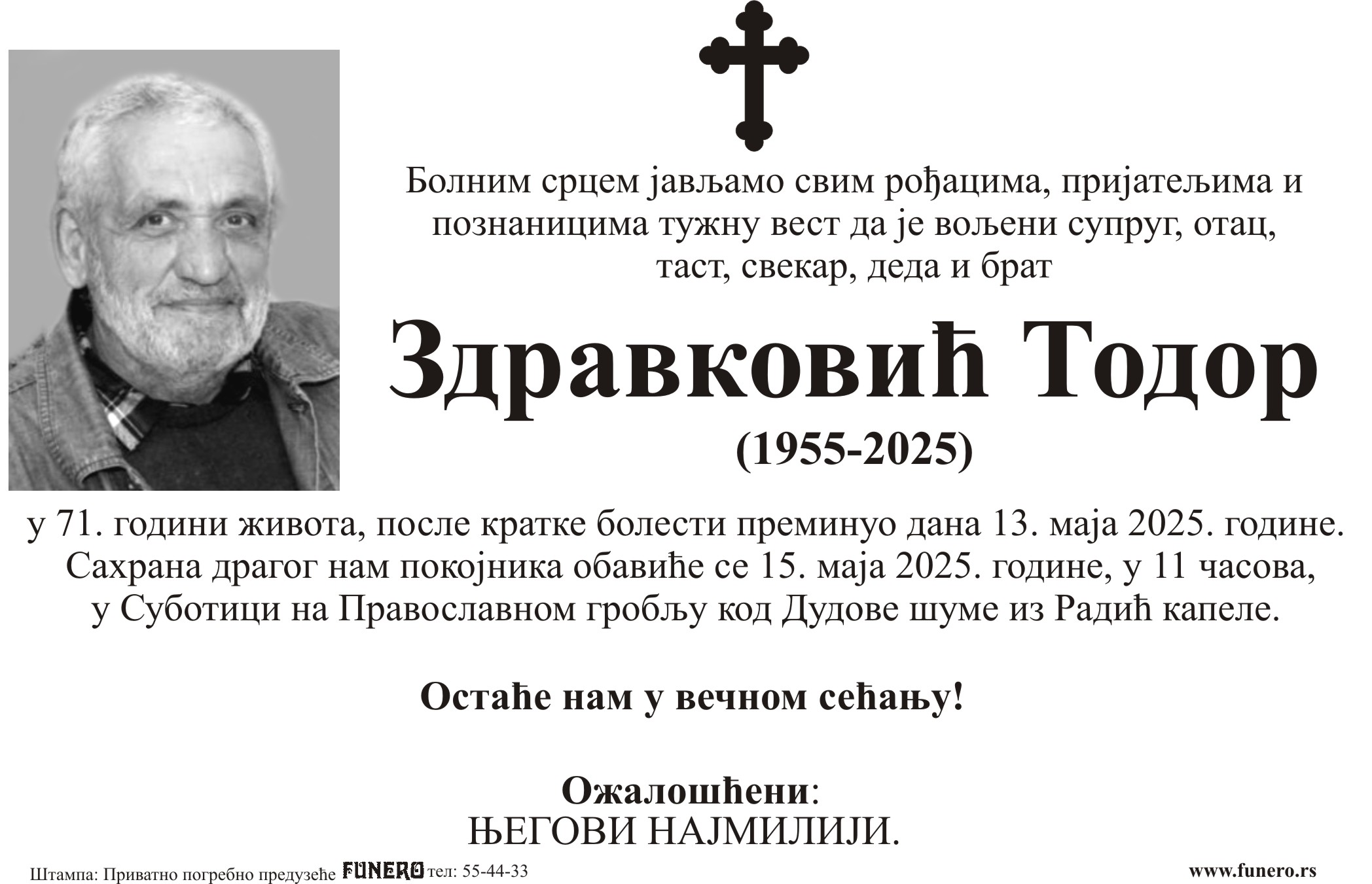 U 70. godini preminuo je Todor Zdravković iz Subotice, iz Žetelačke ulice. Sahrana je 15. maja u 11 časova na Pravoslavnom groblju kod Dudove šume iz Radić kapele.