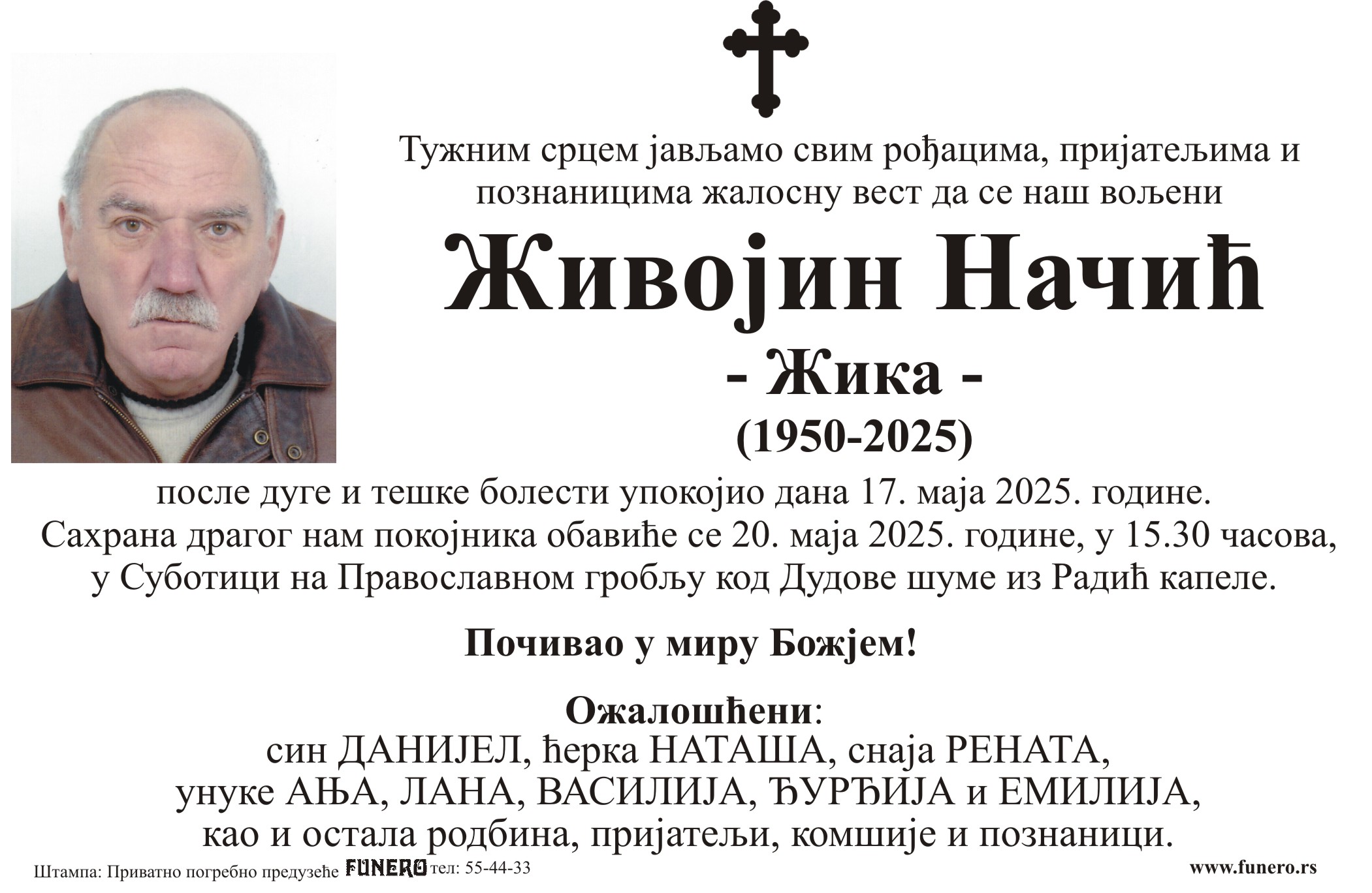U 75. godini preminuo je Živojin Načić iz Subotice, sa Trga Jakaba i Komora. Sahrana je 20. maja u 15 časova i 30 minuta na Pravoslavnom groblju kod Dudove šume iz Radić kapele.
