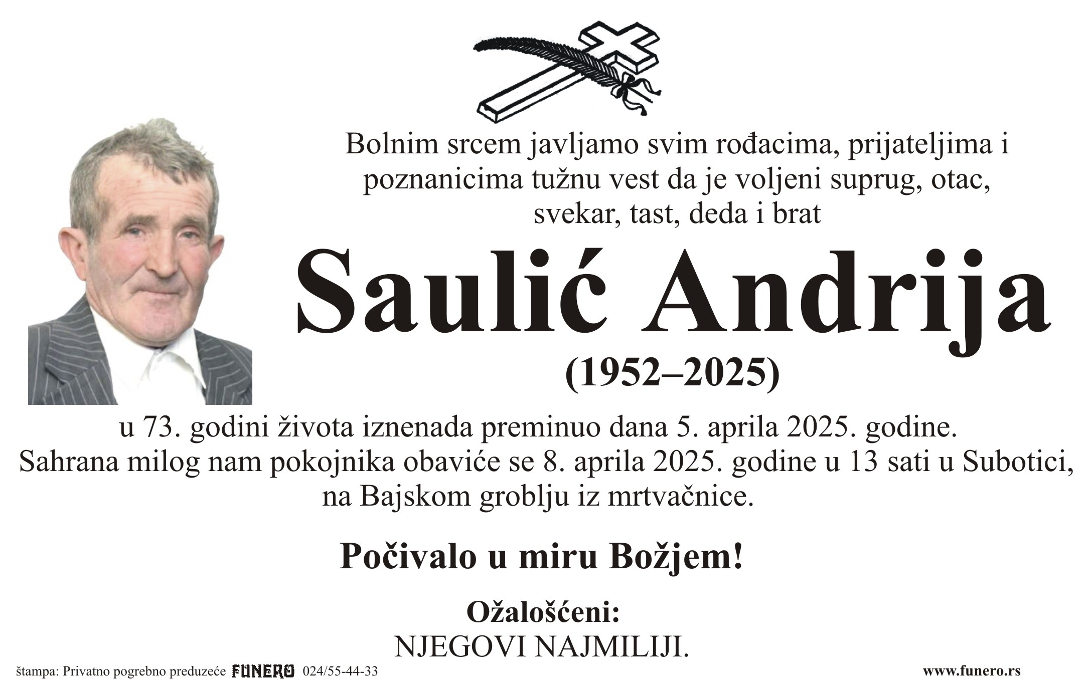 U 73. godini preminuo je Andrija Saulić iz Subotice, sa Aleksandrovih salaša. Sahrana je 8. aprila u 13 sati na Bajskom groblju iz mrtvačnice.