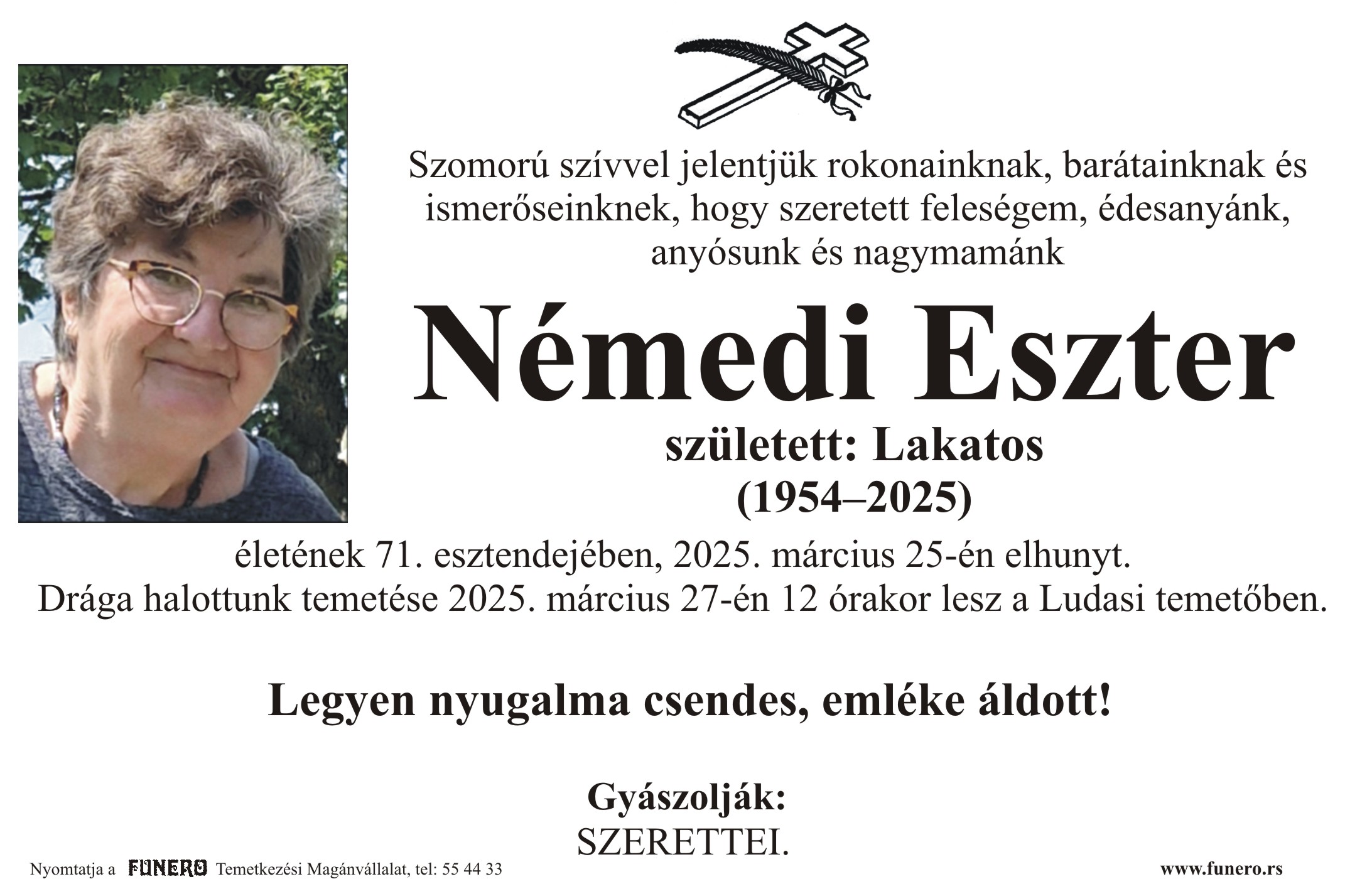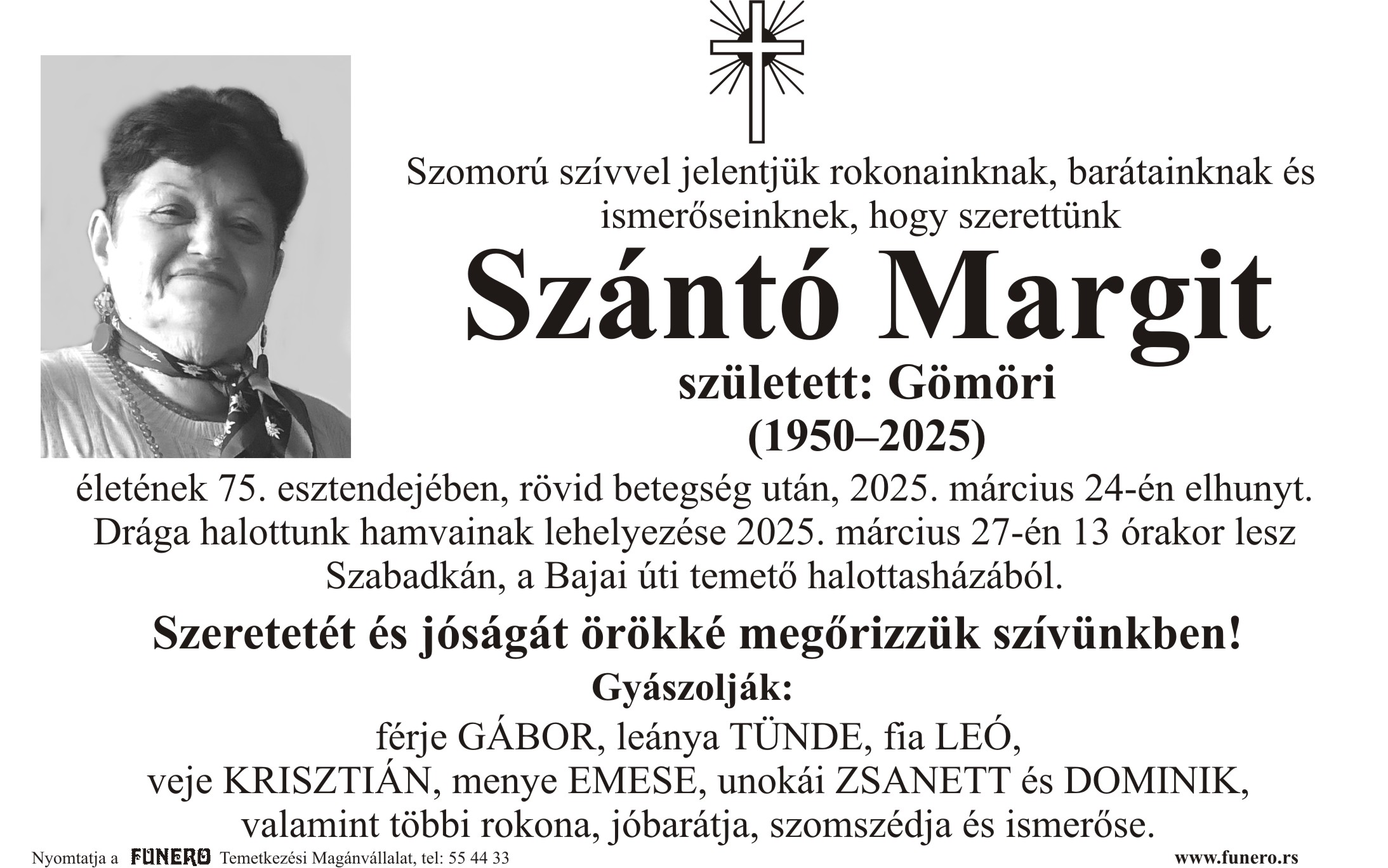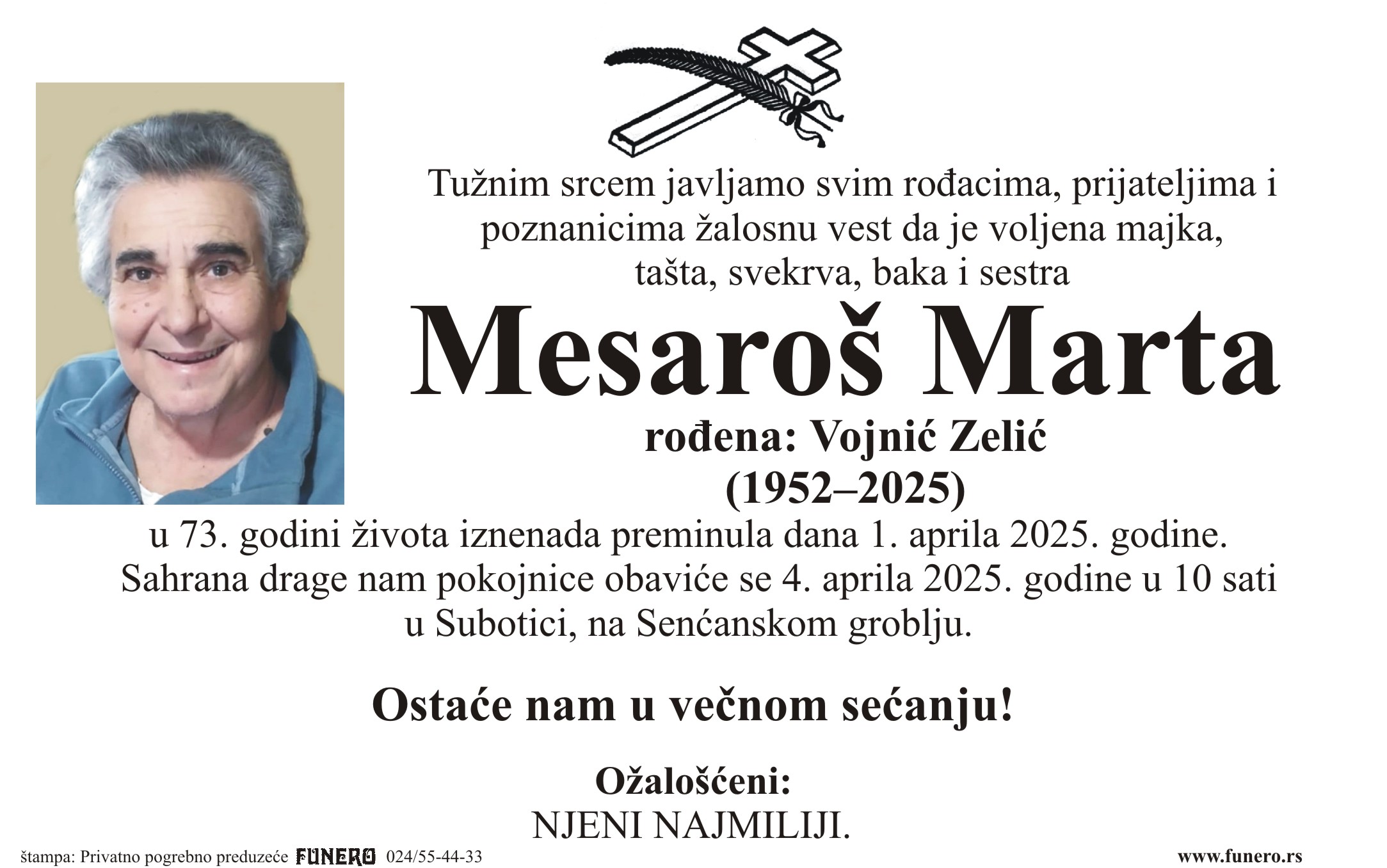 Preminula u 74. godini života. Sahrana pokojnika biće obavljena 25.03.2025. godine, u 10:30 časova na Senćanskom groblju.