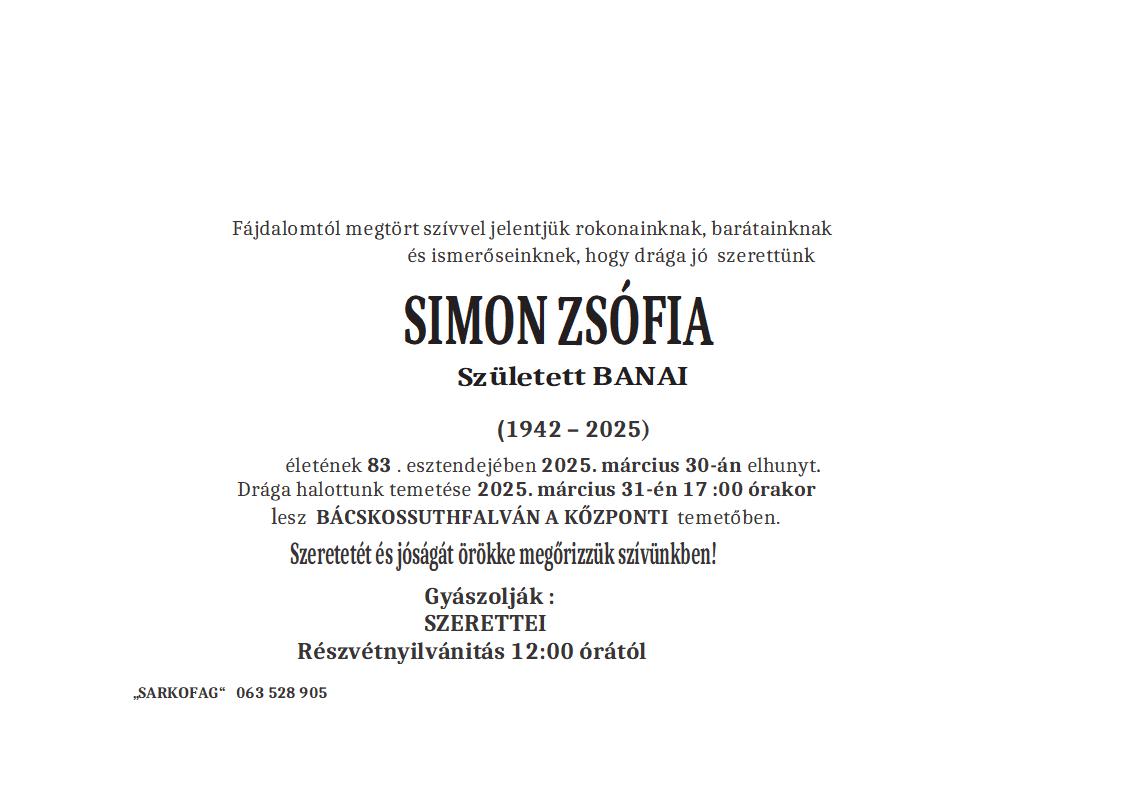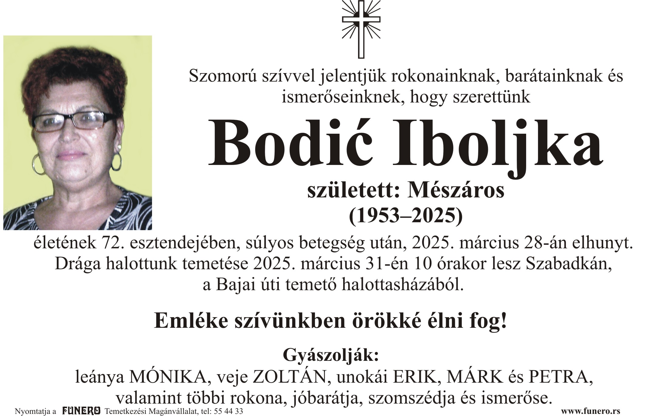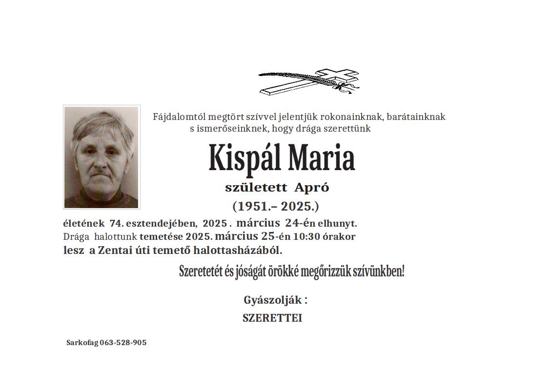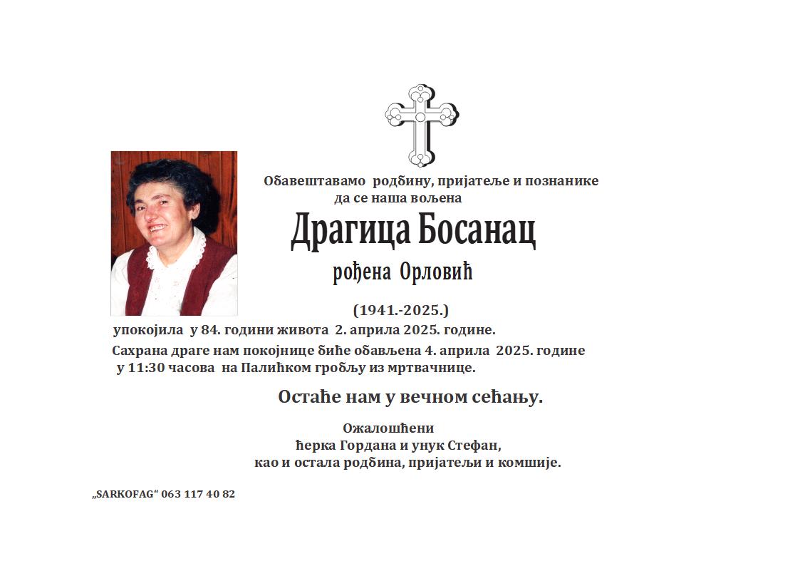 Preminula u 74. godini života. Sahrana pokojnika biće obavljena 25.03.2025. godine, u 10:30 časova na Senćanskom groblju.