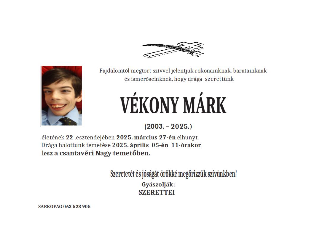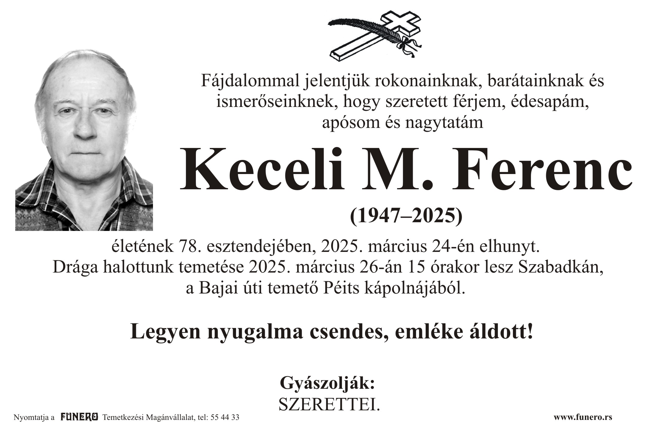 U 78. godini preminuo je Ferenc Keceli Mesaroš iz Subotice, iz ulice Paje Marganovića. Sahrana je 26. marta u 15 sati na Bajskom groblju iz Peić kapele.