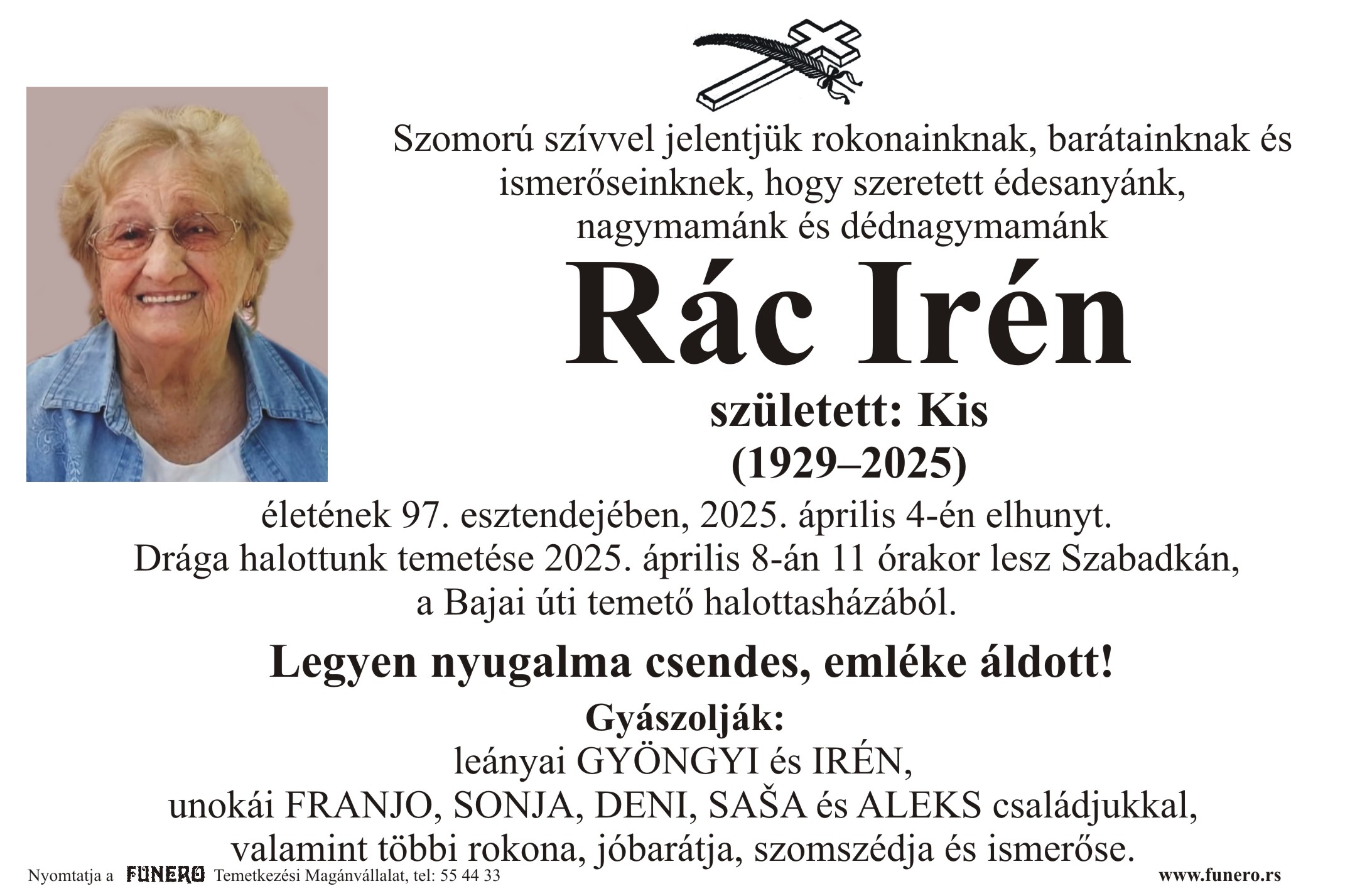 U 96. godini preminula je Iren Rac iz Subotice, iz Srednje ulice. Sahrana je 8. aprila u 11 sati na Bajskom groblju iz mrtvačnice.