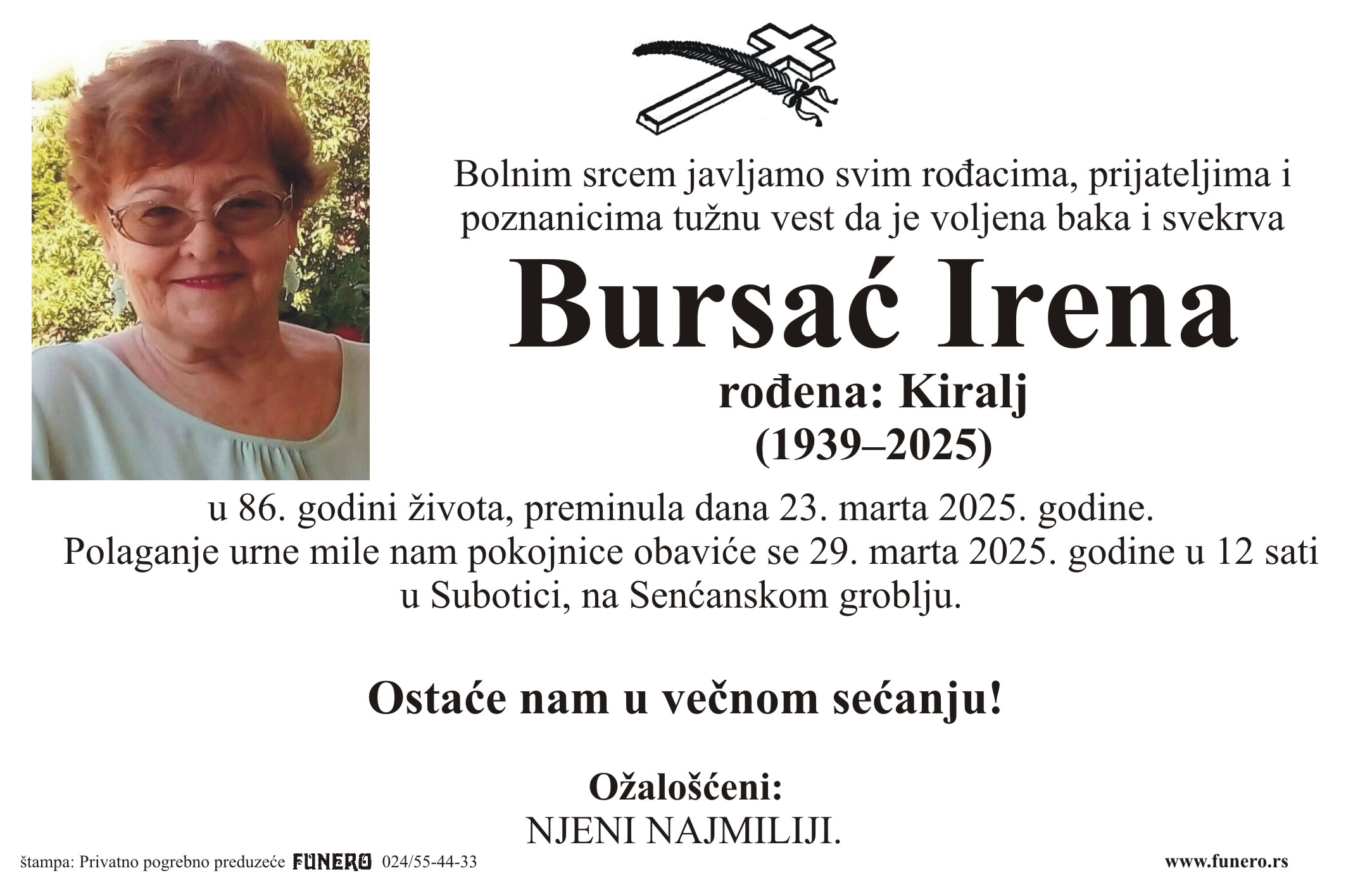 U 86. godini preminula je Irena Bursać iz Subotice, iz ulice Braće Jugovića. Polaganje urne je 29. marta u 12 sati na Senćanskom groblju.