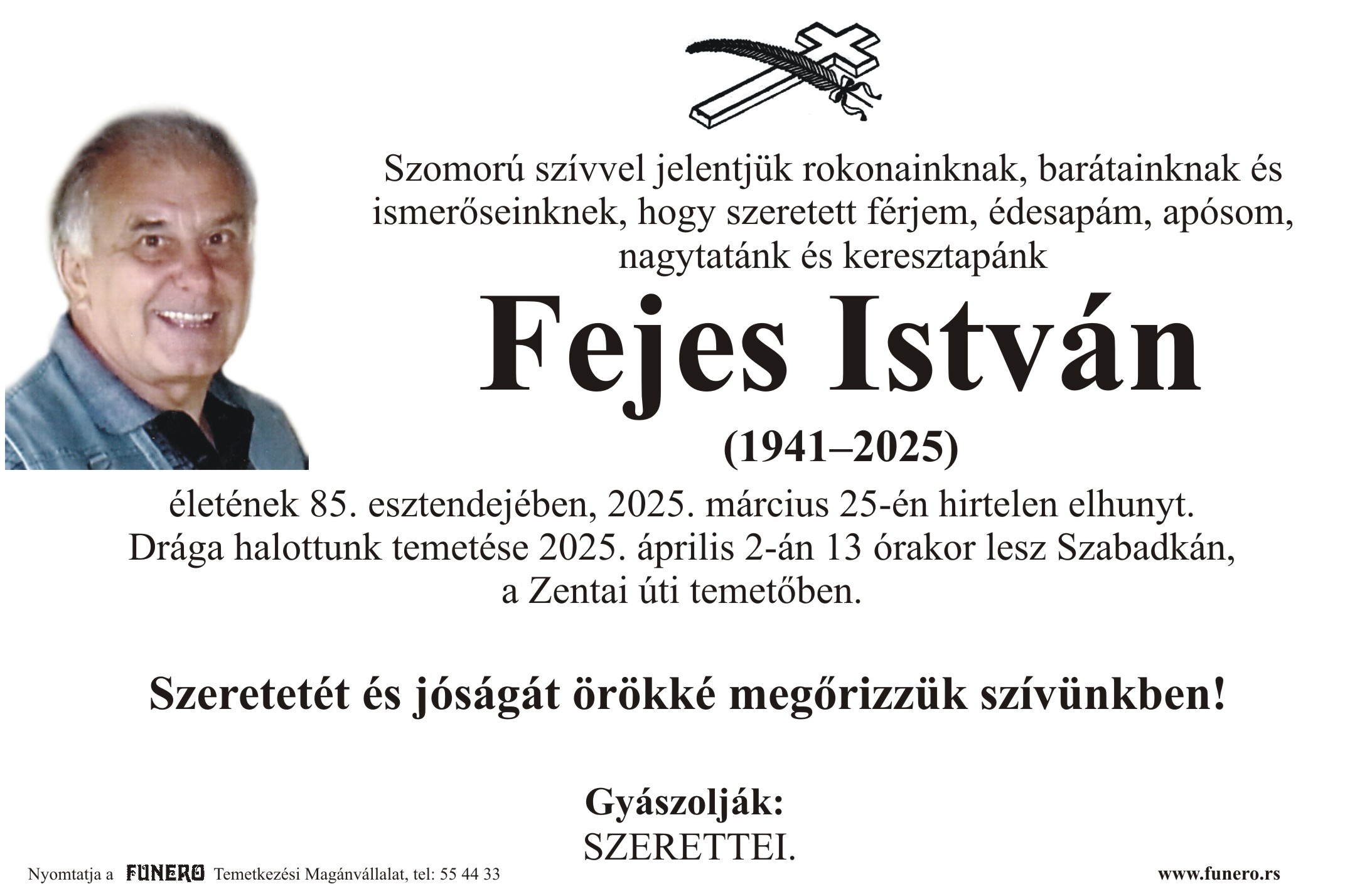 U 84. godini preminuo je Ištvan Feješ iz Subotice, sa Aleje maršala Tita. Sahrana je 2. aprila u 13 sati na Senćanskom groblju.