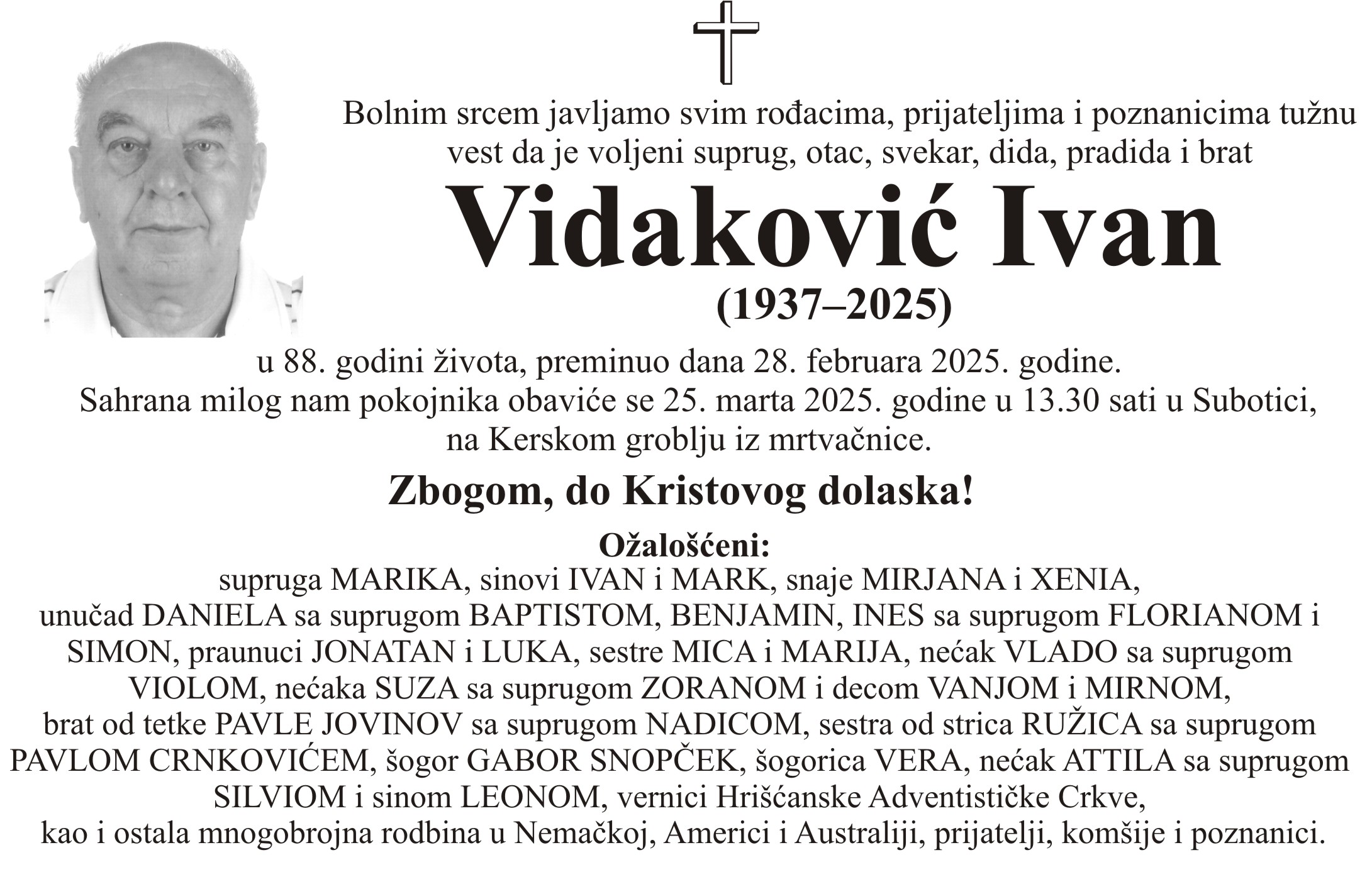 U 88. godini preminuo je Ivan Vidaković iz Subotice. Sahrana je 25. marta u 13 sati i 30 minuta na Kerskom groblju iz mrtvačnice.
