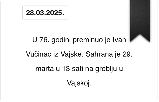 U 76. godini preminuo je Ivan Vučinac iz Vajske. Sahrana je 29. marta u 13 sati na groblju u Vajskoj.
