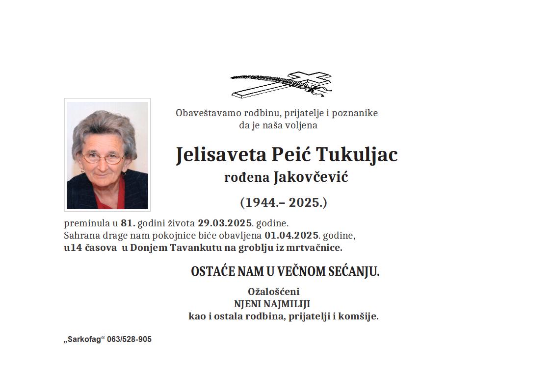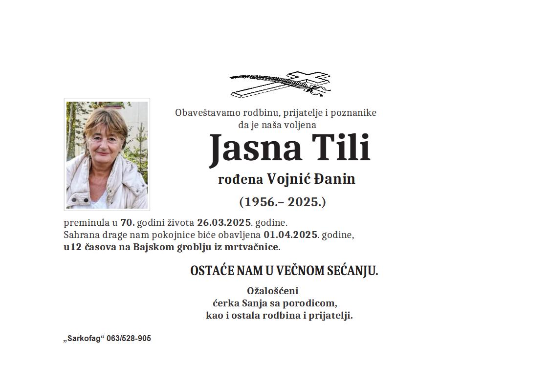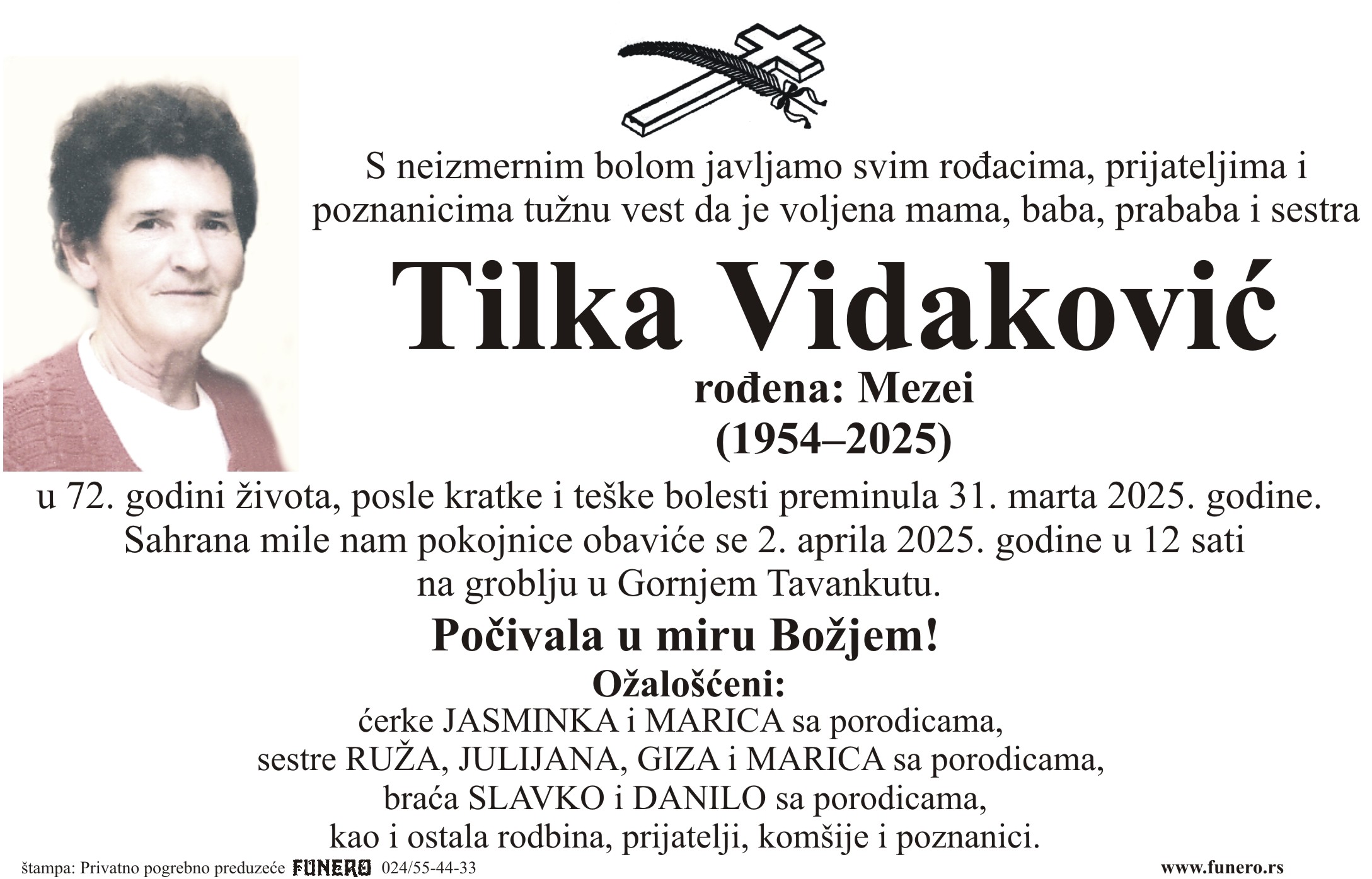 U 71. godini preminula je Tilka Vidaković iz Gornjeg Tavankuta, iz Zlatnog kraja. Sahrana je 2. aprila u 12 sati na groblju u Gornjem Tavankutu.