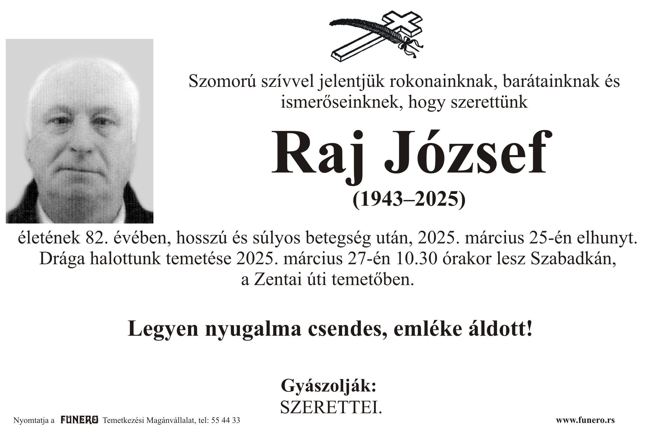 U 82. godini preminuo je Jožef Raj iz Subotice, sa Majšanskog puta. Sahrana je 27. marta u 10 sati i 30 minuta na Senćanskom groblju.