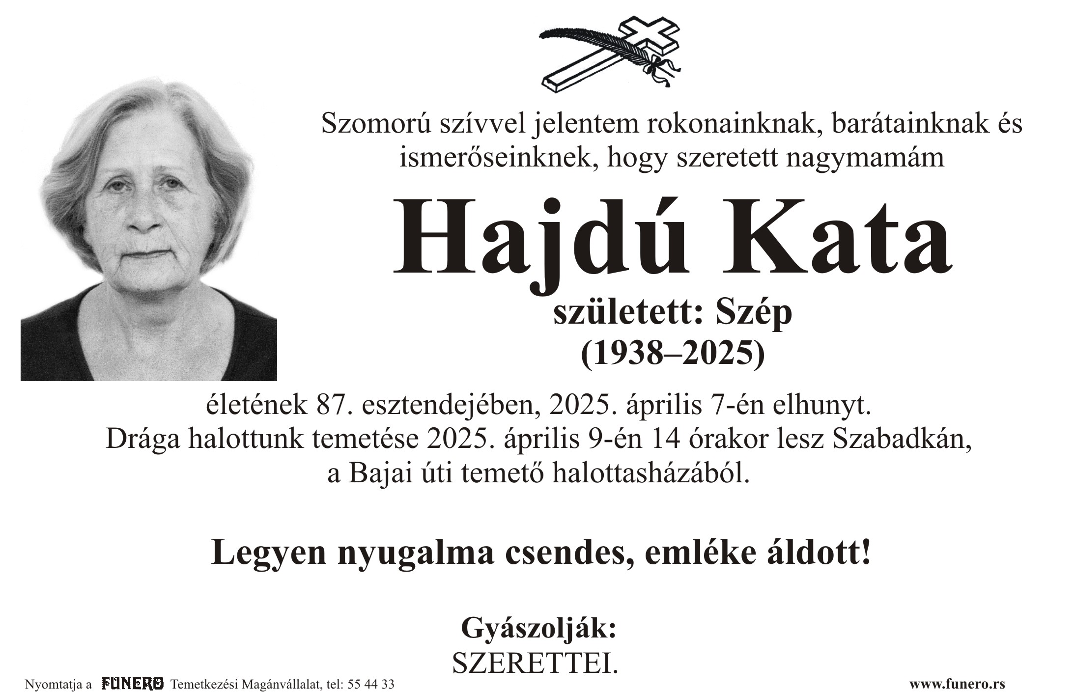 U 87. godini preminula je Kata Hajdu iz Subotice, iz ulice Arsenija Čarnojevića. Sahrana je 9. aprila u 14 sati na Bajskom groblju iz mrtvačnice.