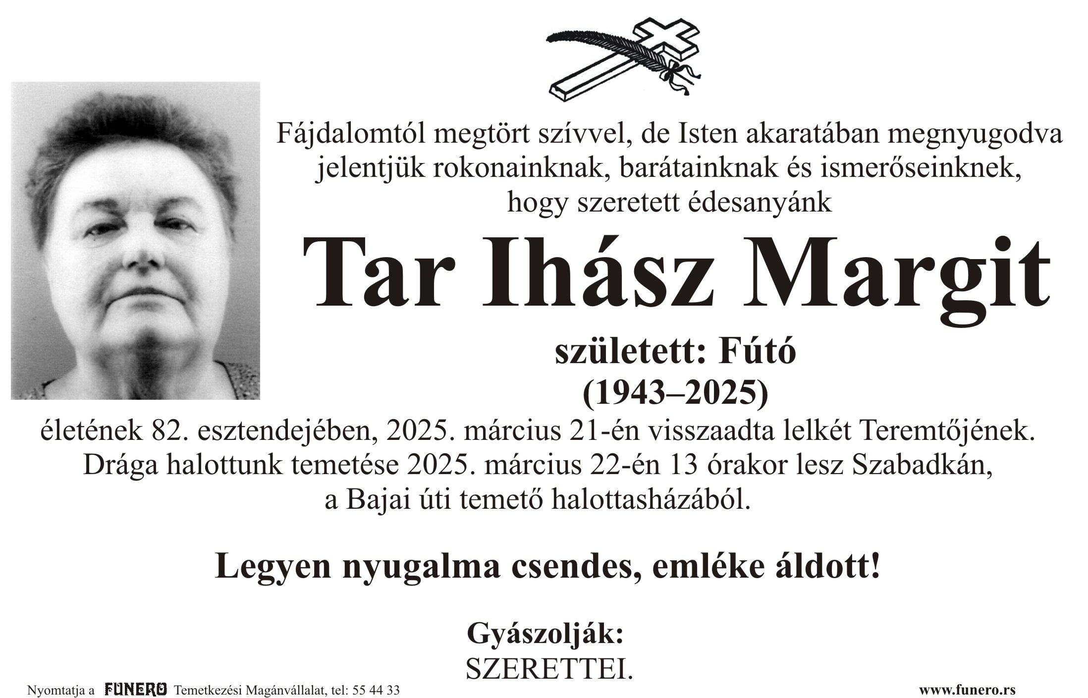 U 82. godini preminula je Margit Tar Ihas iz Subotice, iz ulice Sonje Marinković. Sahrana je 22. marta u 13 sati na Bajskom groblju iz Peić kapele.