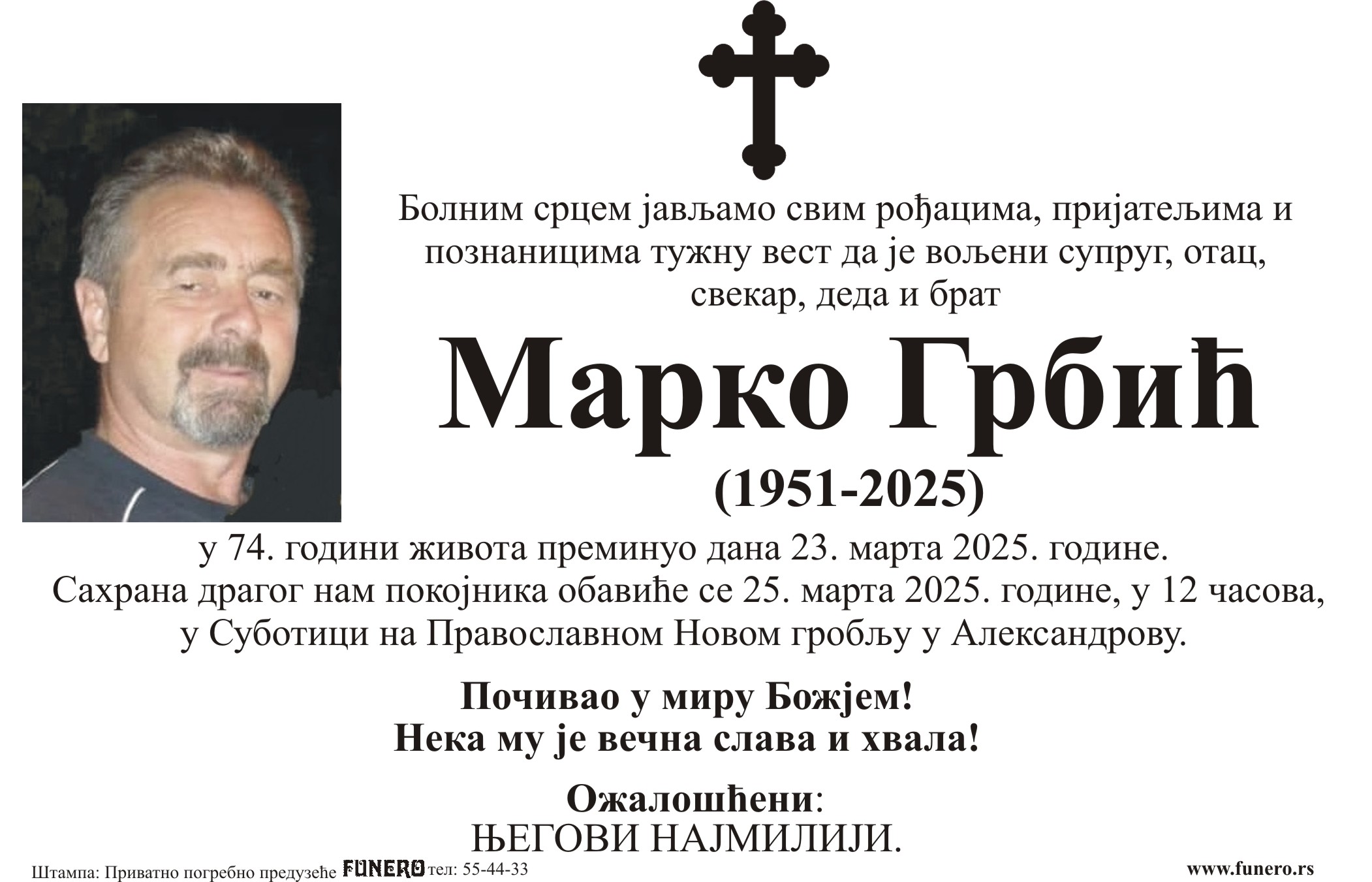U 74. godini preminuo je Marko Grbić iz Subotice, iz ulice Blaška Rajića. Sahrana je 25. marta u 12 časova na Pravoslavnom Novom groblju u Aleksandrovu.