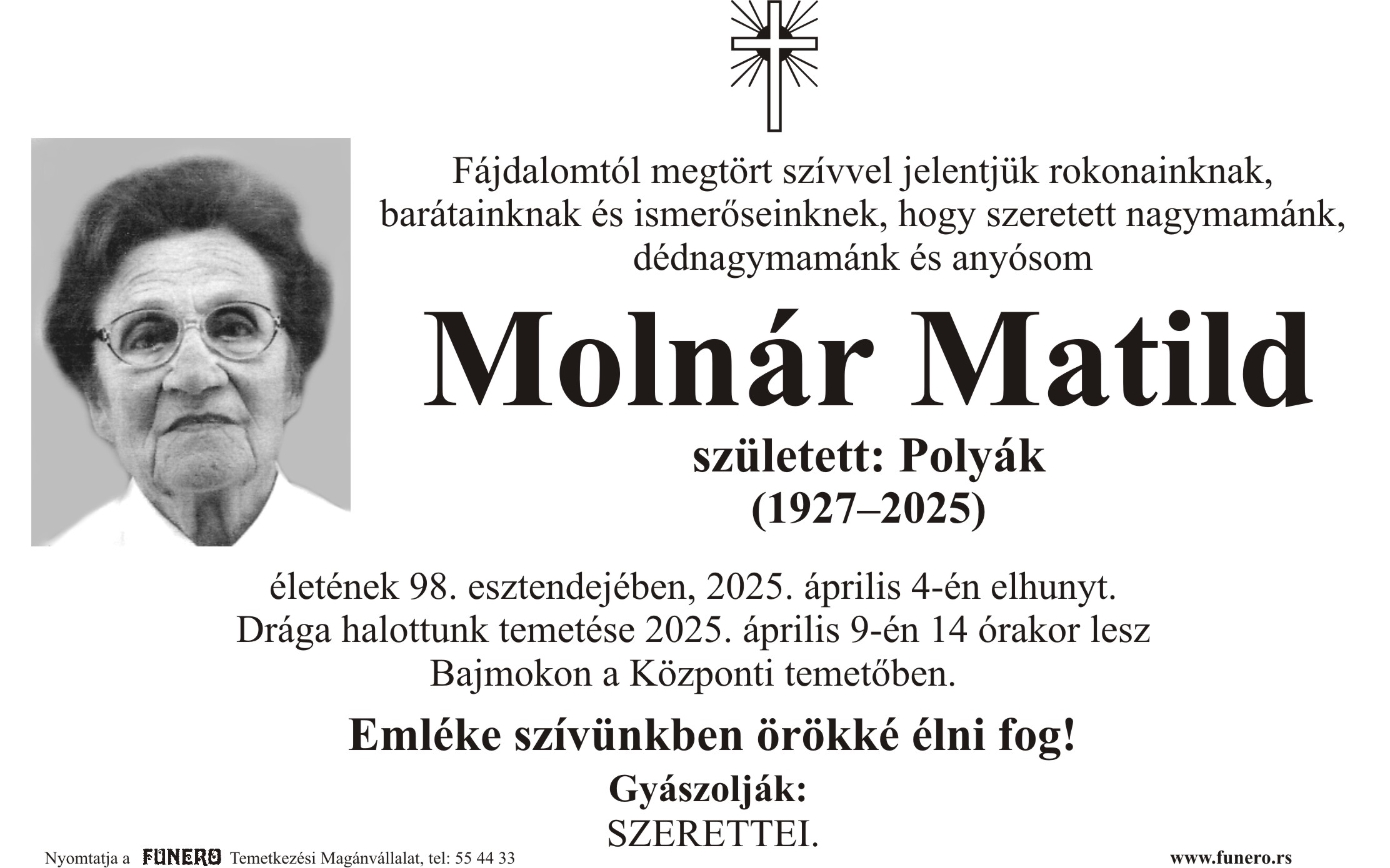 U 98. godini preminula je Matild Molnar iz Bajmoka. Sahrana je 9. aprila u 14 sati na Centralnom groblju u Bajmoku.