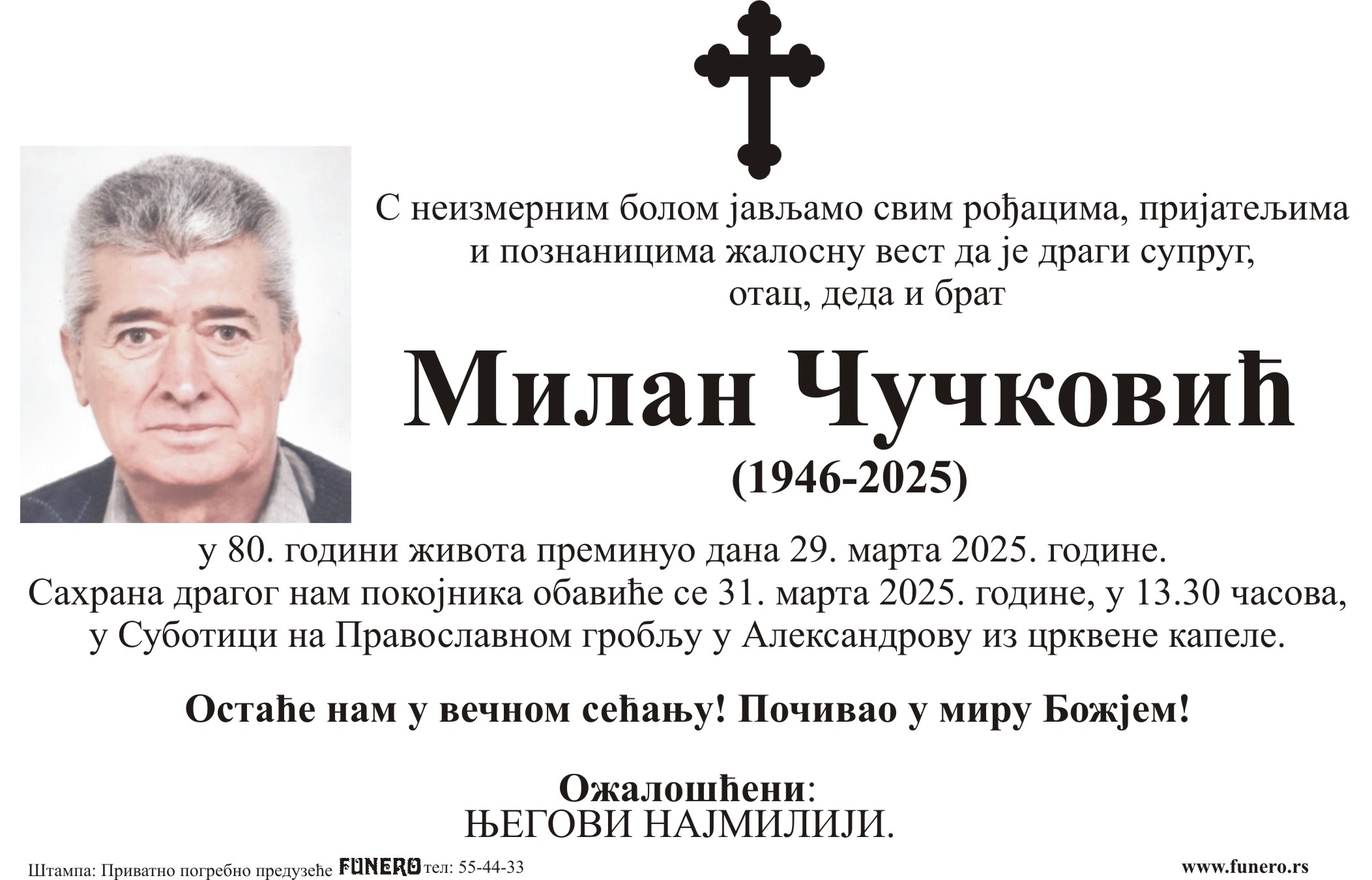U 79. godini preminuo je Milan Čučković iz Subotice, iz ulice Lovre Bračuljevića. Sahrana je 31. marta u 13 časova i 30 minuta na Pravoslavnom groblju u Aleksandrovu iz crkvene kapele.