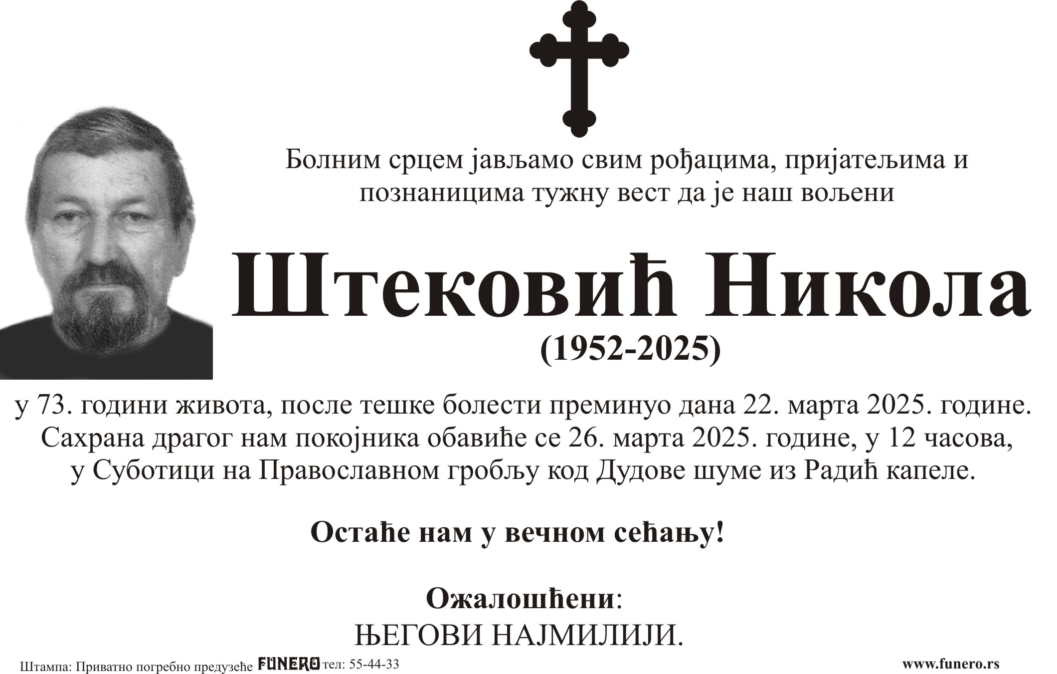 U 73. godini preminuo je Nikola Šteković iz Subotice, iz ulice Hajduk Veljka. Sahrana je 26. marta u 12 časova na Pravoslavnom groblju kod Dudove šume iz Radić kapele.