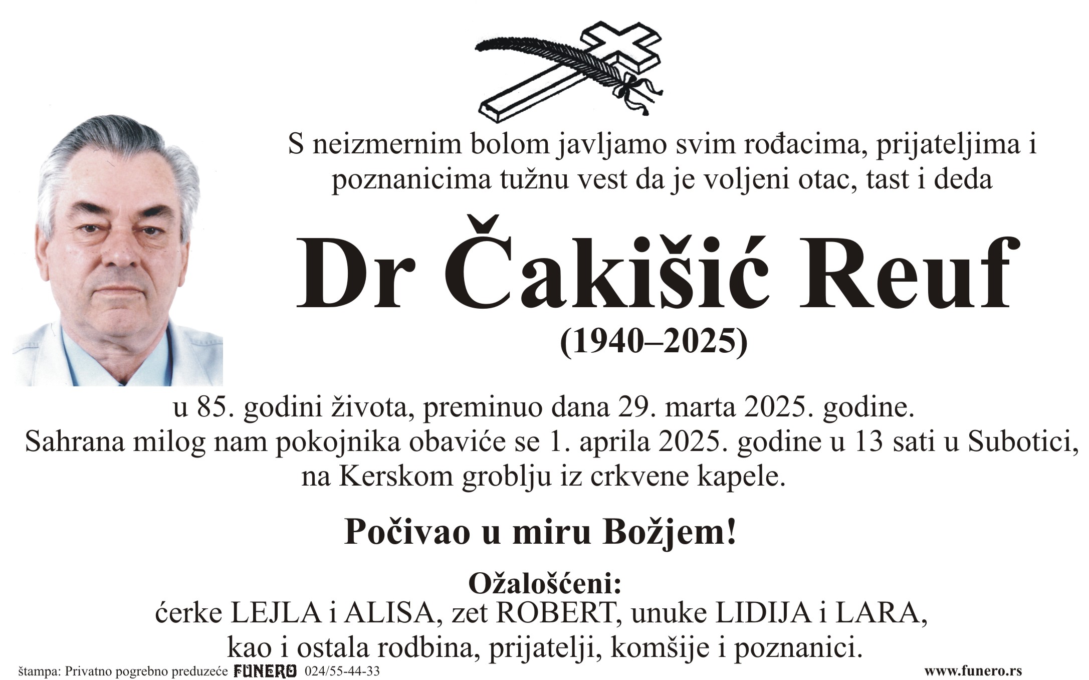 U 85. godini preminuo je Reuf Čakišić iz Subotice, iz ulice Ivana Antunovića. Sahrana je 1. aprila u 13 sati na Kerskom groblju u iz crkvene kapele.