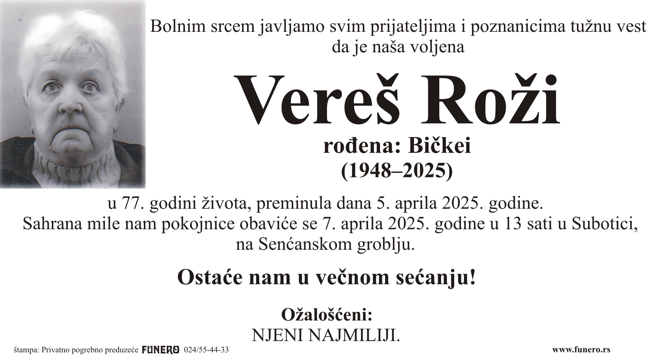 U 77. godini preminula je Roži Vereš iz Subotice, sa Pačirskog puta. Sahrana je 7. aprila u 13 sati na Senćanskom groblju.