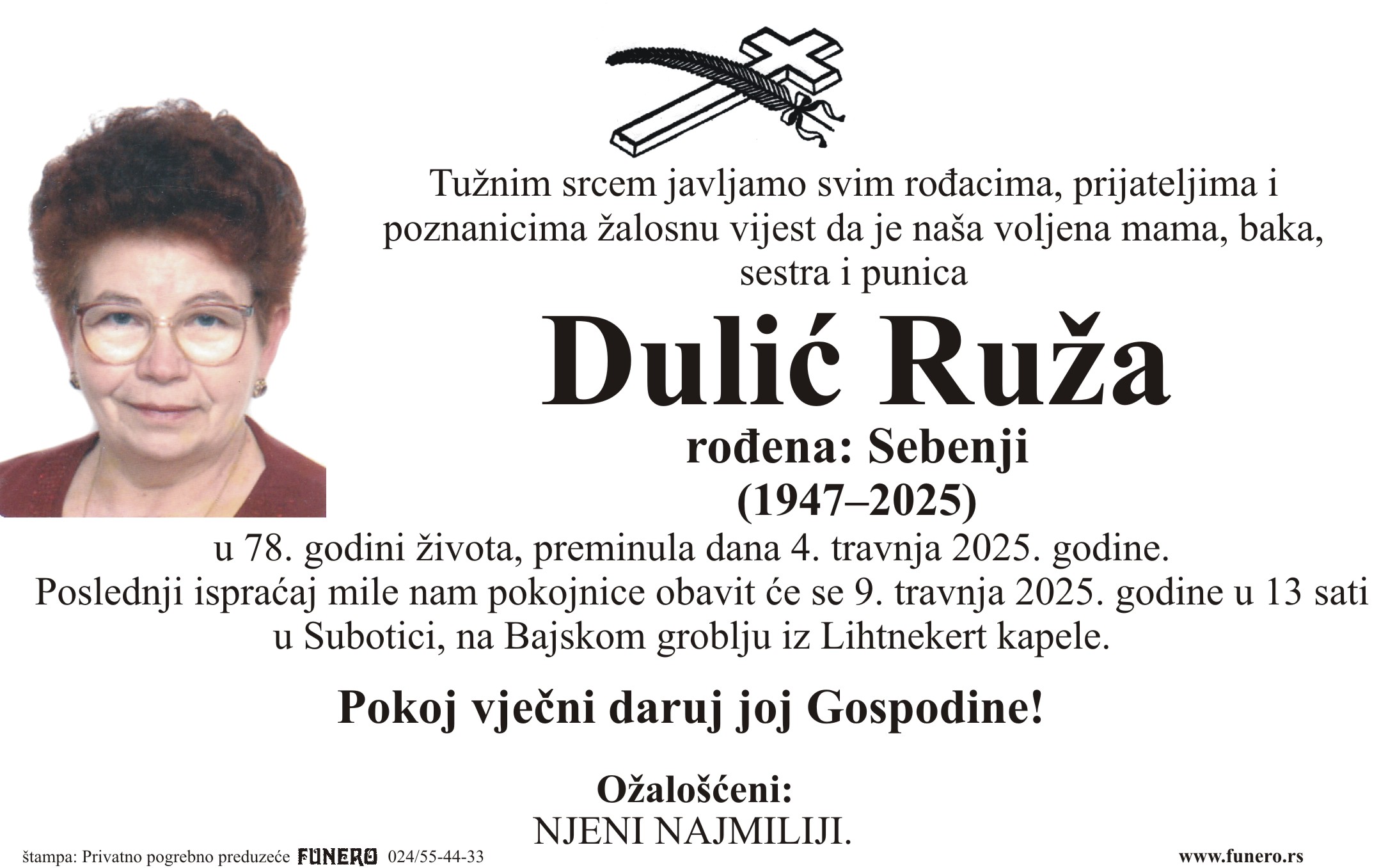 U 78. godini preminula je Ruža Dulić iz Subotice, iz ulice Svete Katarine. Sahrana je 9. aprila u 13 sati na Bajskom groblju iz Lihtnekert kapele.