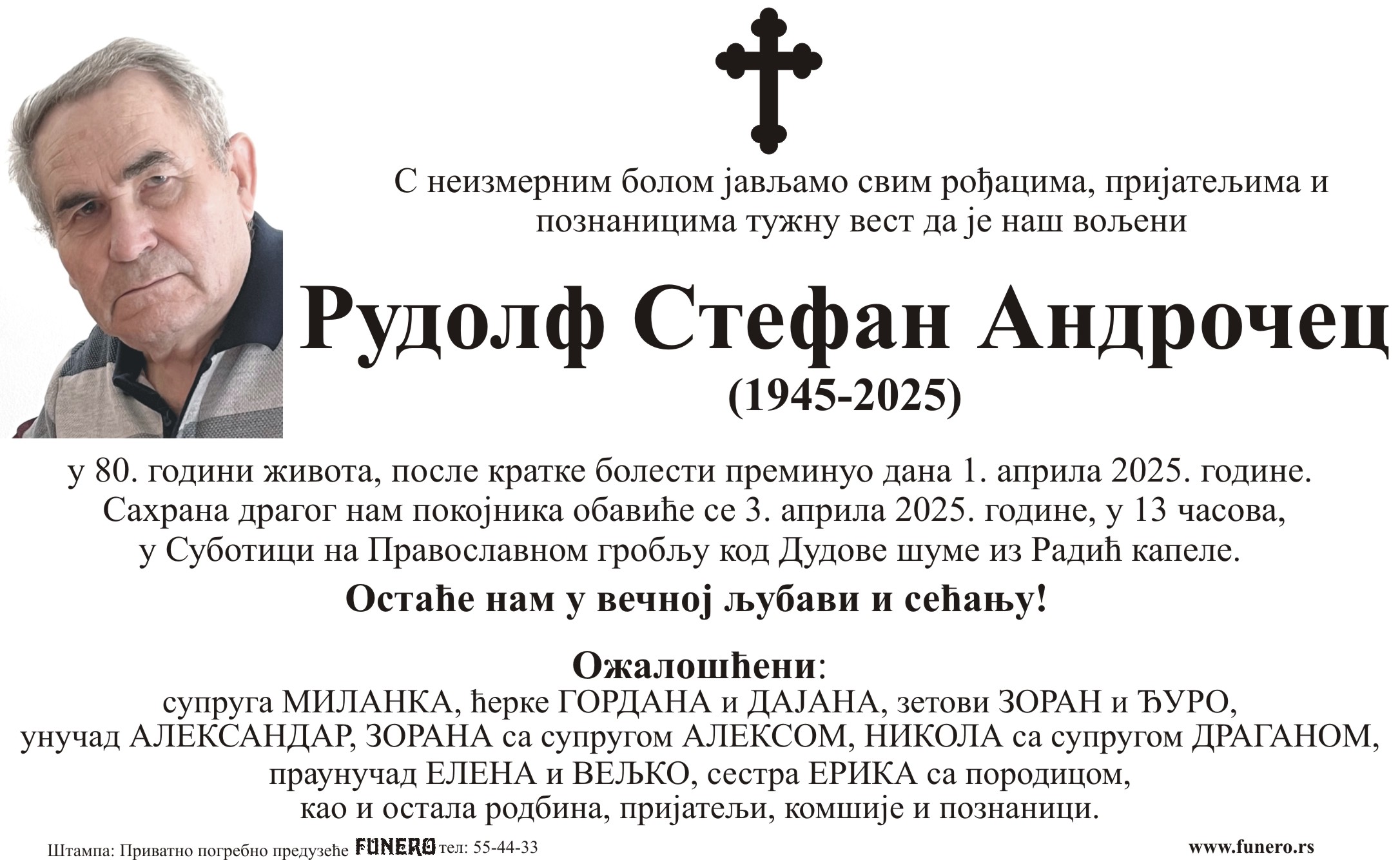 U 80. godini preminuo je Rudolf Stefan Andročec iz Subotice, iz ulice 8. marta. Sahrana je 3. aprila u 13 časova na Pravoslavnom groblju kod Dudove šume iz Radić kapele.