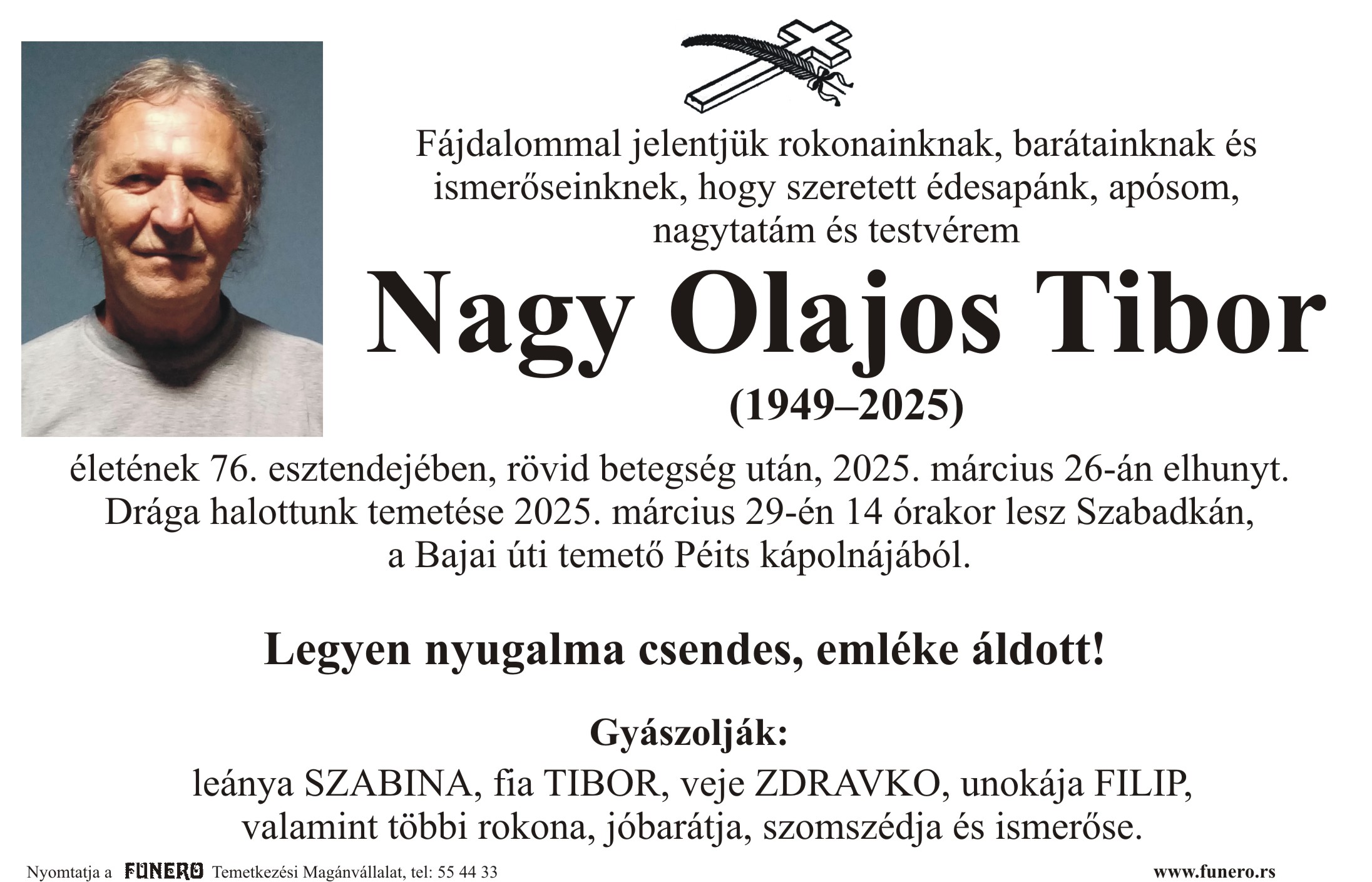 U 76. godini preminuo je Tibor Nađ Olajoš iz Subotice, iz Idrijske ulice. Sahrana je 29. marta u 14 sati na Bajskom groblju iz Peić kapele.