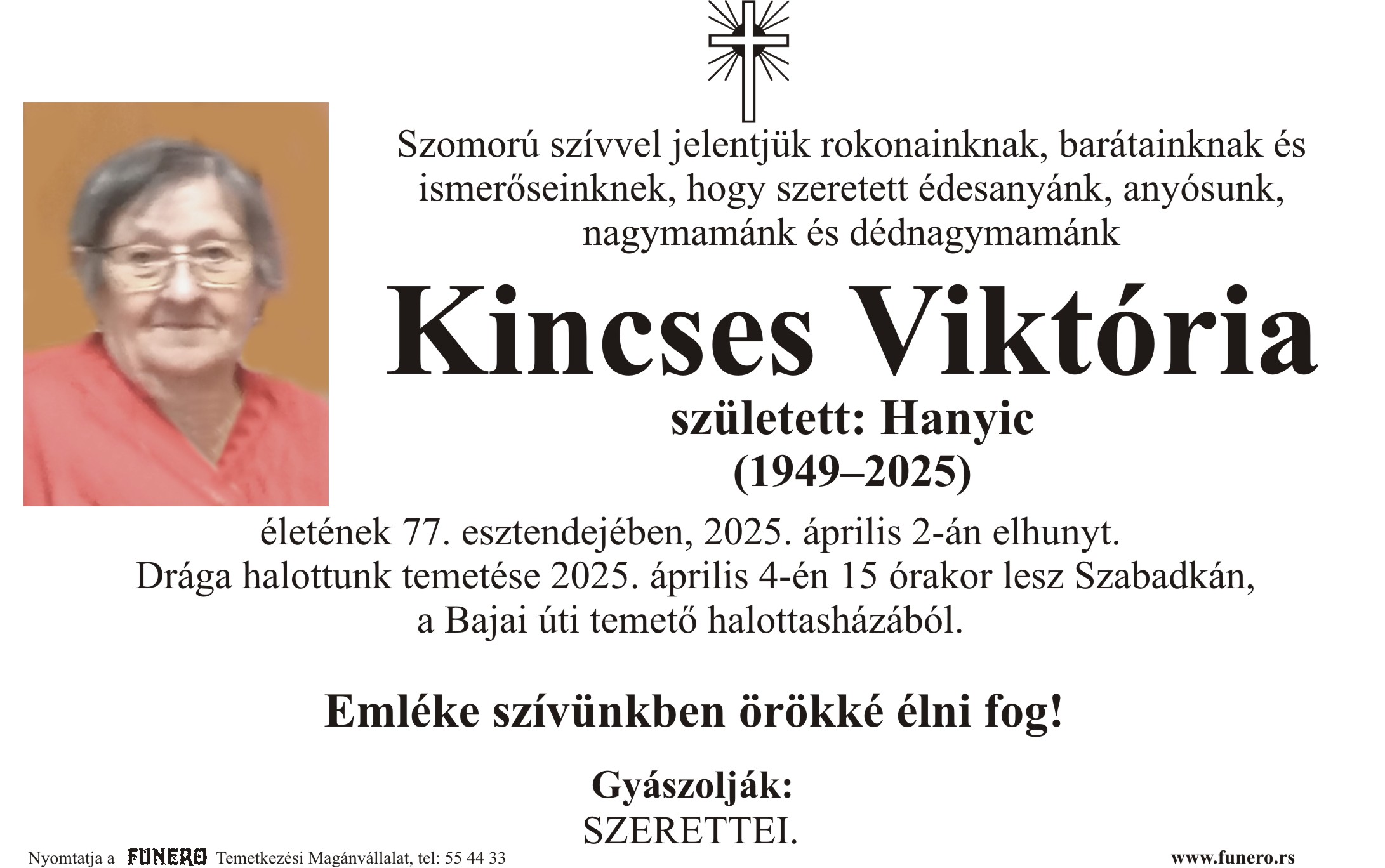 U 76. godini preminula je Viktoria Kinčeš iz Subotice, iz ulice Starine Novaka. Sahrana je 4. aprila u 15 sati na Bajskom groblju iz mrtvačnice.