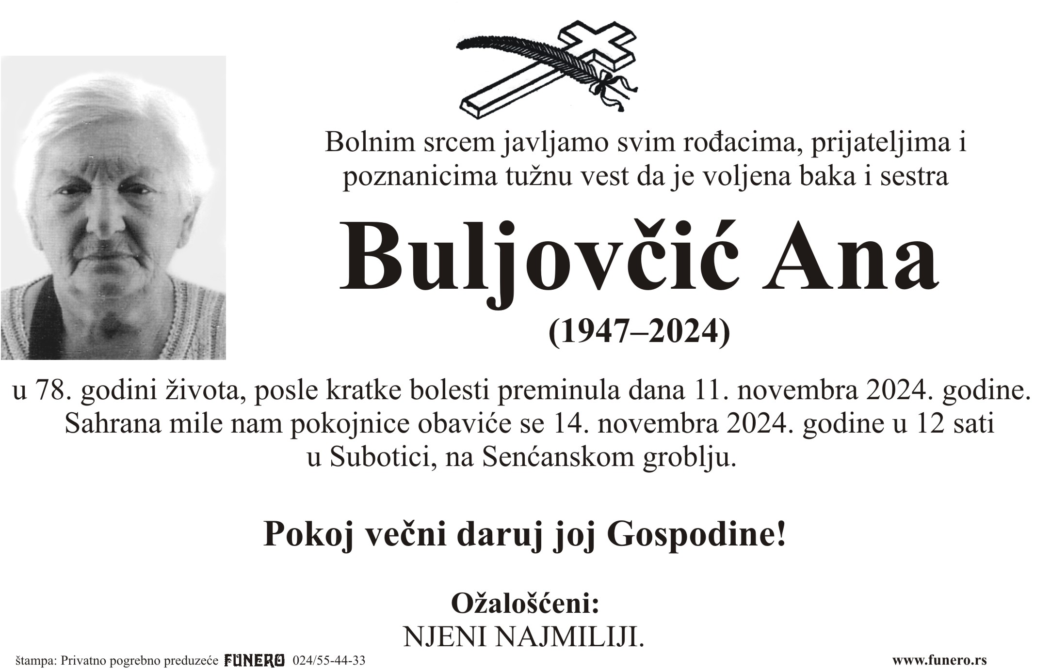 U 77. godini preminula je Ana Buljovčić iz Subotice, sa Aleje maršala Tita. Sahrana je 14. novembra u 12 sati na Senćanskom groblju.