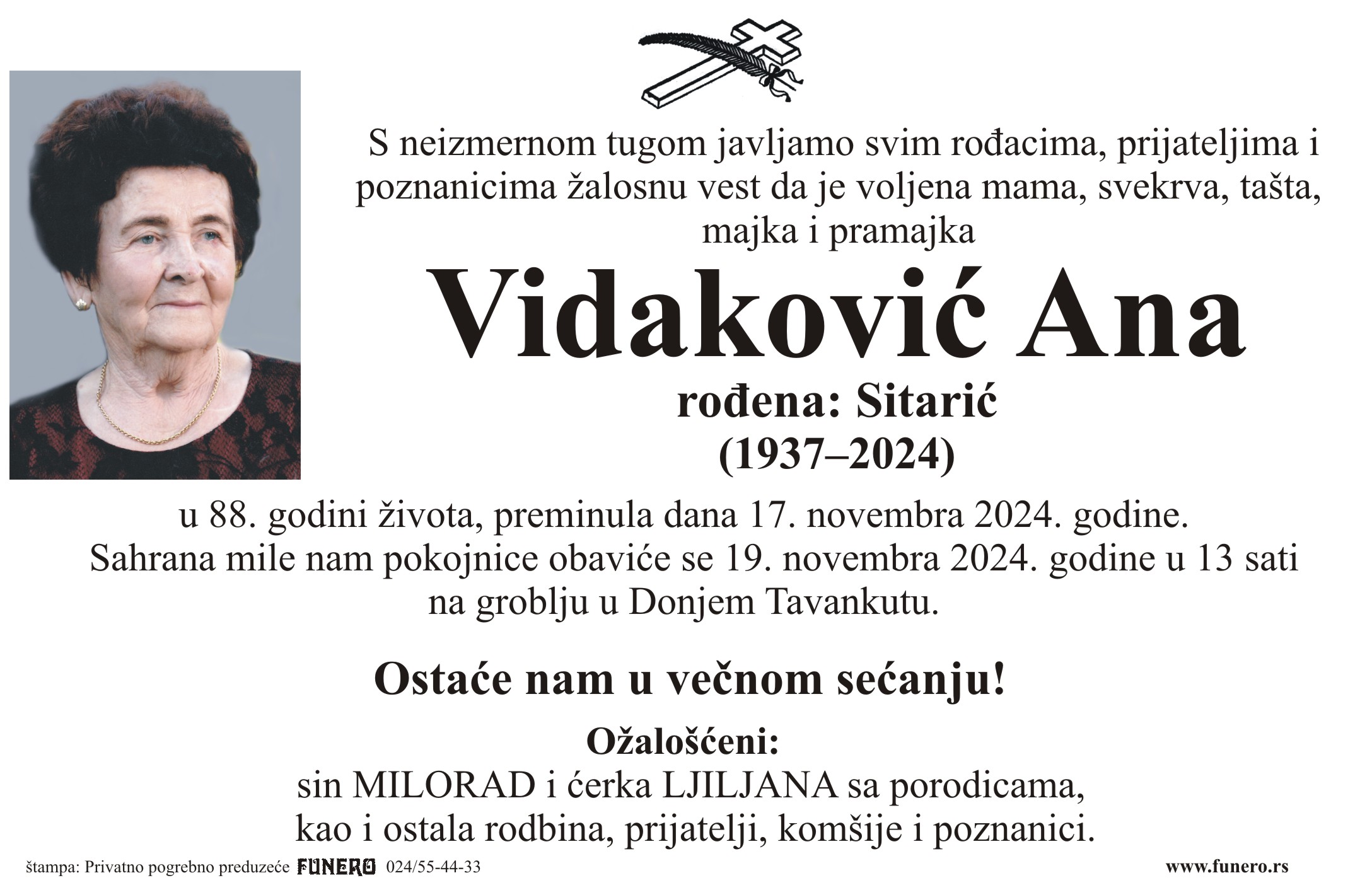 U 87. godini preminula je Ana Vidaković iz Gornjeg Tavankuta. Sahrana je 19. novembra u 13 sati na groblju u Donjem Tavankutu.