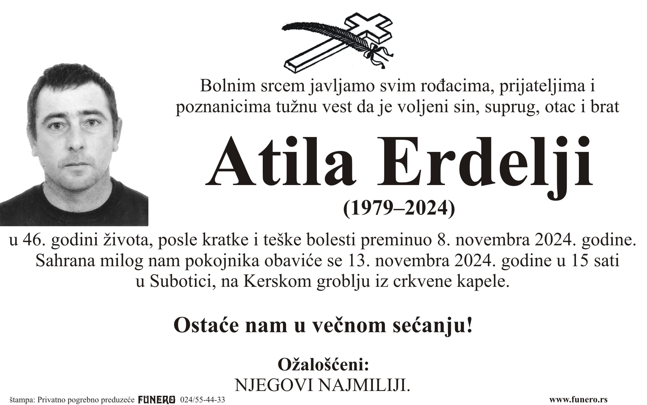 U 45. godini preminuo je Atila Erdelji iz Bikova. Sahrana je danas u 15 sati na Kerskom groblju iz crkvene kapele.