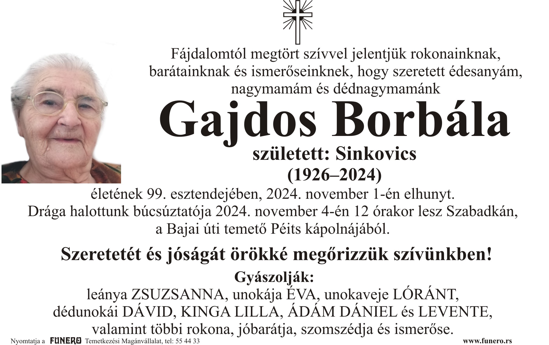 U 98. godini preminula je Borbala Gajdoš iz Subotice, iz Triglavske ulice. Ispraćaj je 4. novembra u 12 sati na Bajskom groblju iz Peić kapele.