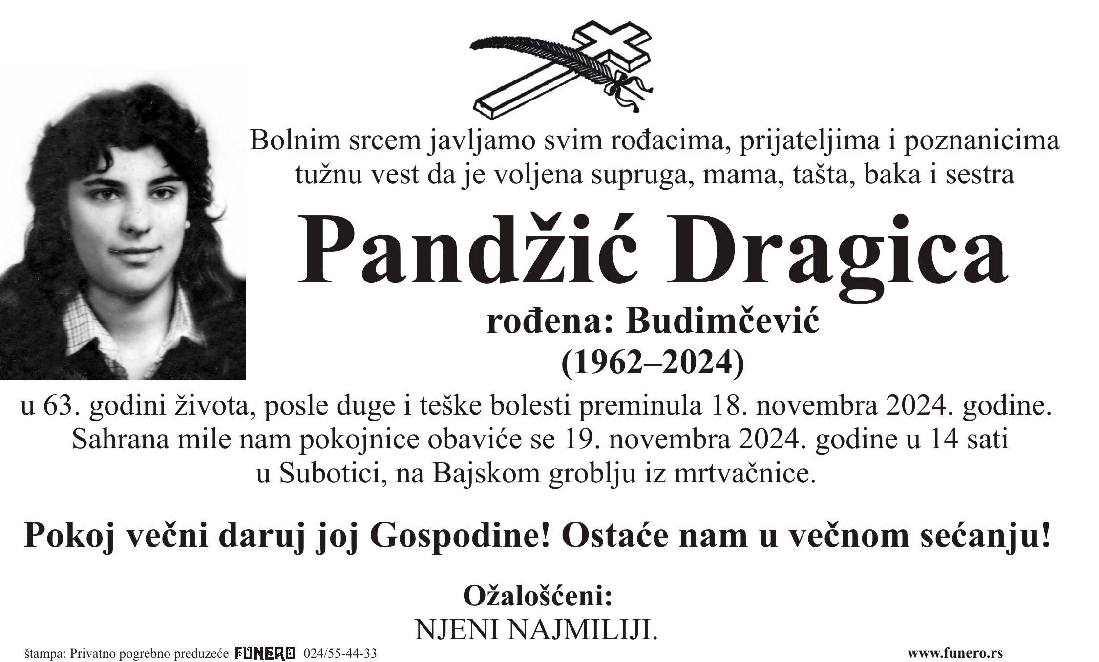 U 62. godini preminula je Dragica Pandžić iz Subotice, iz Virovitičke ulice. Sahrana je 19. novembra u 14 sati na Bajskom groblju iz mrtvačnice.