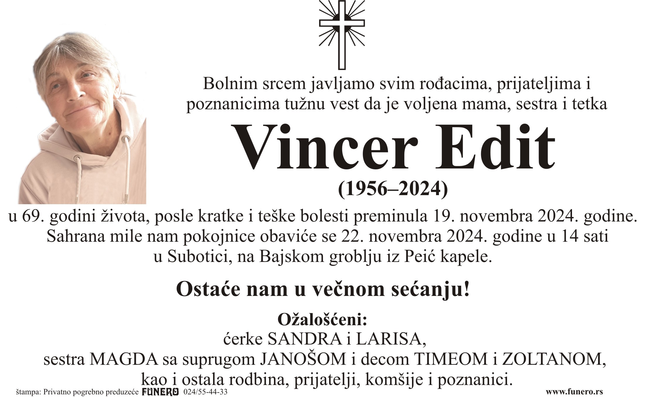 U 68. godini preminula je Edit Vincer iz Subotice, iz Otvorene ulice. Sahrana je 22. novembra u 14 sati na Bajskom groblju iz Peić kapele.