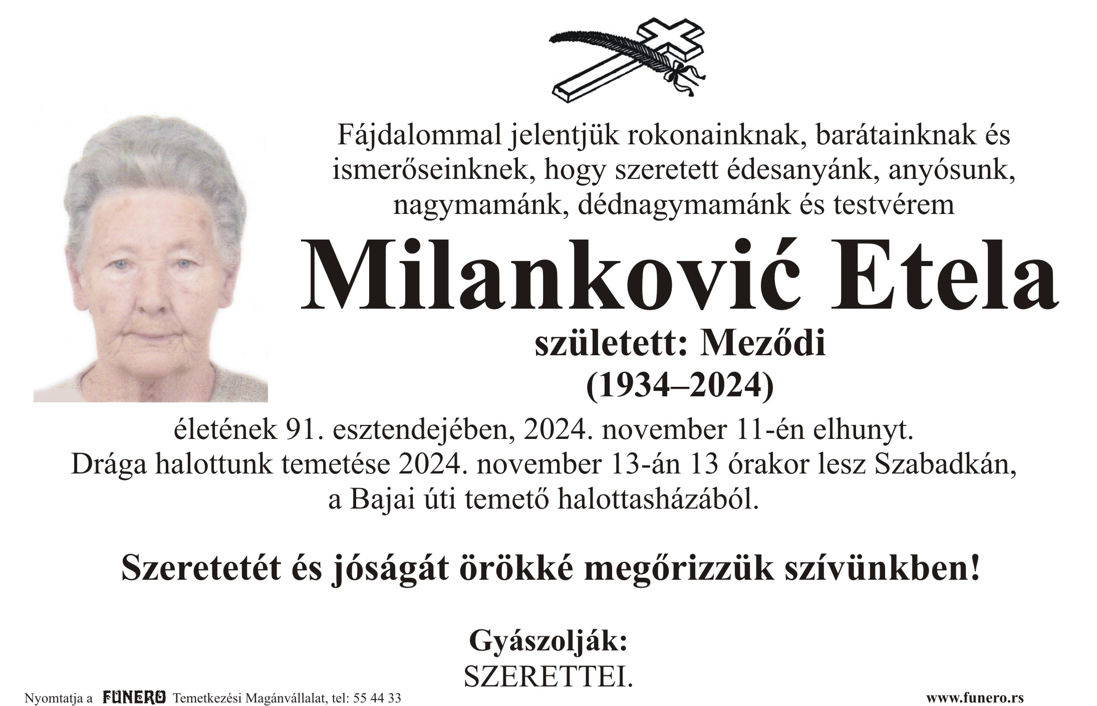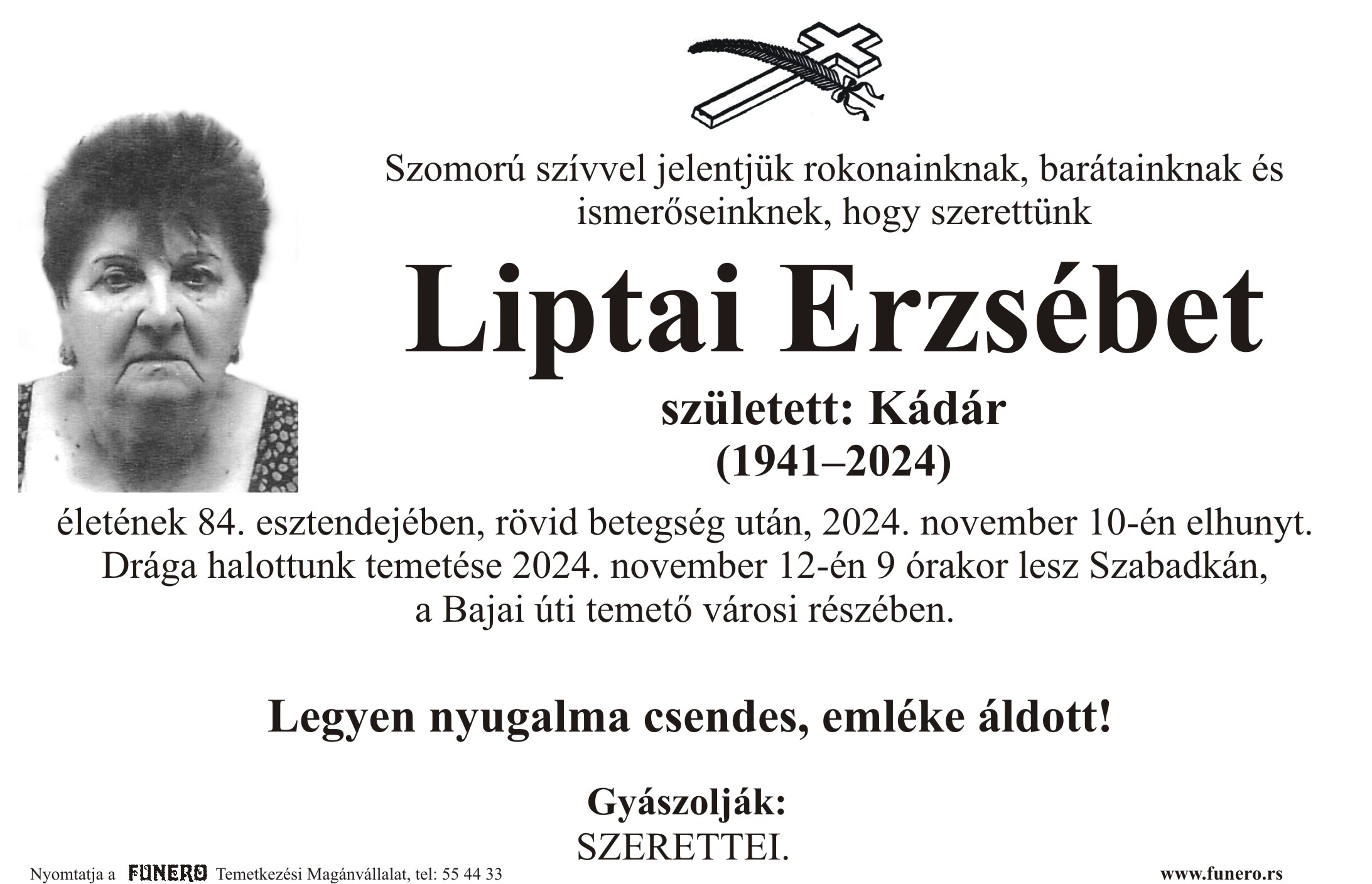 U 83. godini preminula je Eržebet Liptai iz Subotice, iz Solunkse ulice. Sahrana je 12. novembra u 9 sati na gradskom delu Bajskog groblja.