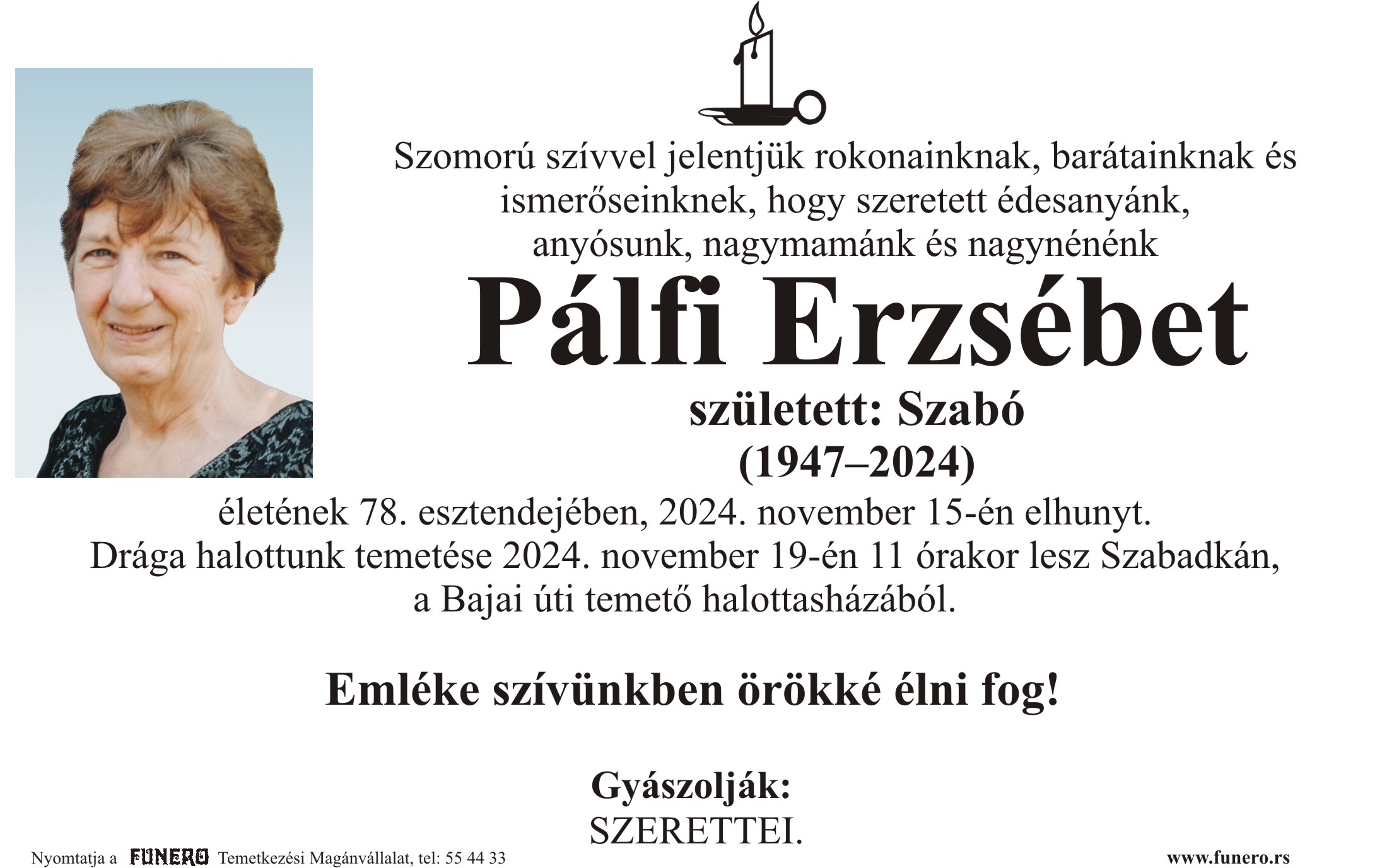 U 77. godini preminula je Eržebet Palfi iz Subotice, iz ulice Maksima Gorkog. Sahrana je 19. novembra u 11 sati na Bajskom groblju iz mrtvačnice.