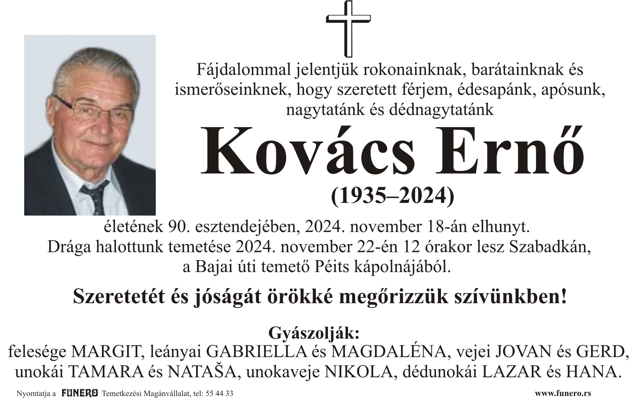 U 89. godini preminuo je Erne Kovač iz Subotice, sa Karađorđevog puta. Sahrana je 22. novembra u 12 sati na Bajskom groblju iz Peić kapele.