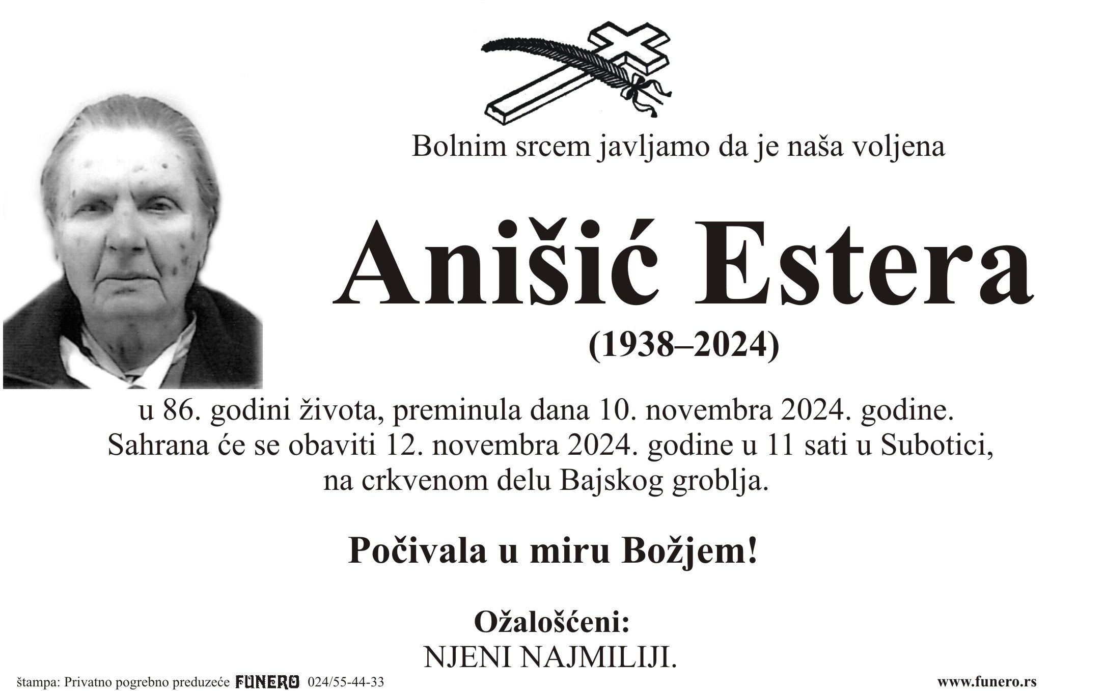 U 86. godini preminula je Estera Anišić iz Subotice, iz ulice Vatroslava Lisinskog. Sahrana je 12. novembra u 11 sati na crkvenom delu Bajskog groblja.