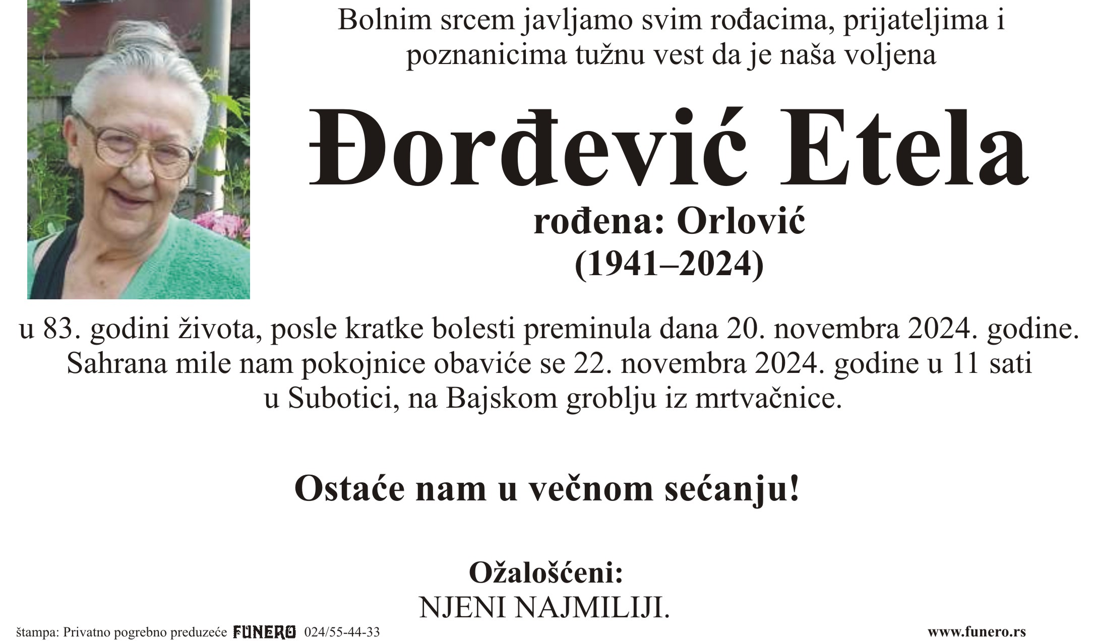 U 83. godini preminula je Etela Đorđević iz Subotice, iz ulice Eugena Kumičića. Sahrana je 22. novembra u 11 sati na Bajskom groblju iz mrtvačnice.