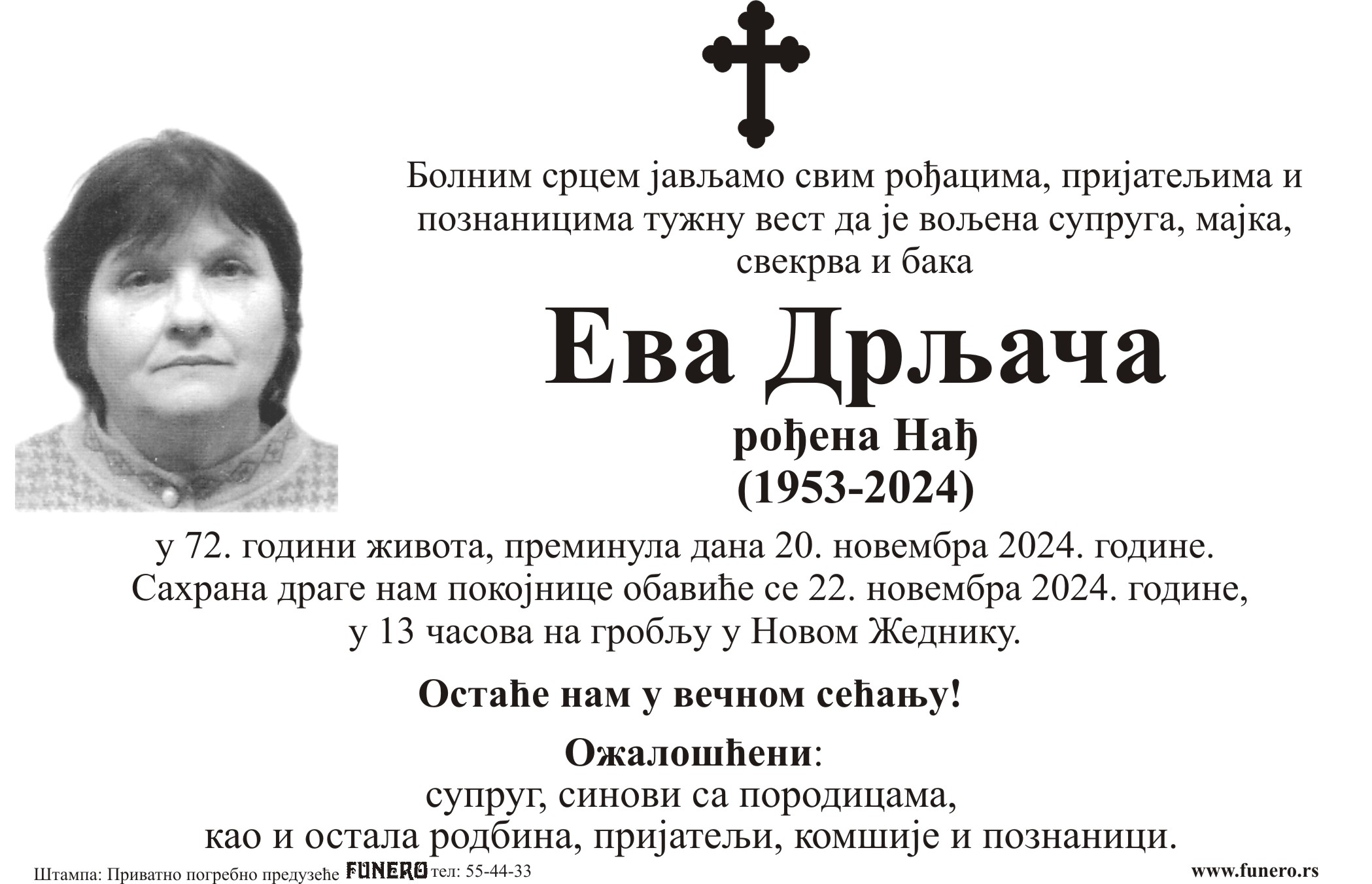 U 71. godini preminula je Eva Drljača iz Novog Žednika, iz ulice Đure Salaja. Sahrana je 22. novembra u 13 časova na groblju u Novom Žedniku.