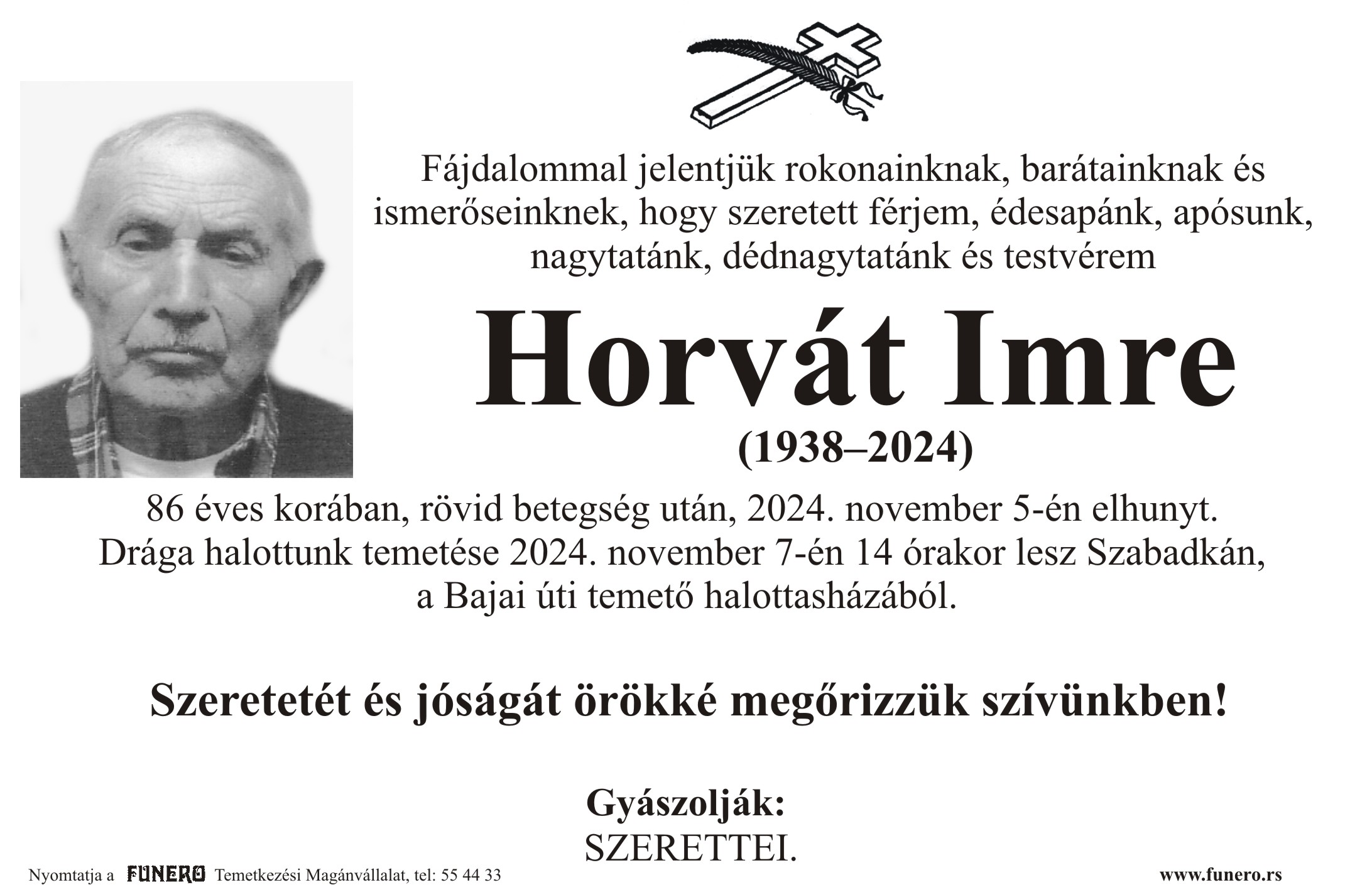 U 86. godini preminuo je Imre Horvat iz Subotice, iz Balzakove ulice. Sahrana je 7. novembra u 14 sati na Bajskom groblju iz mtvačnice.