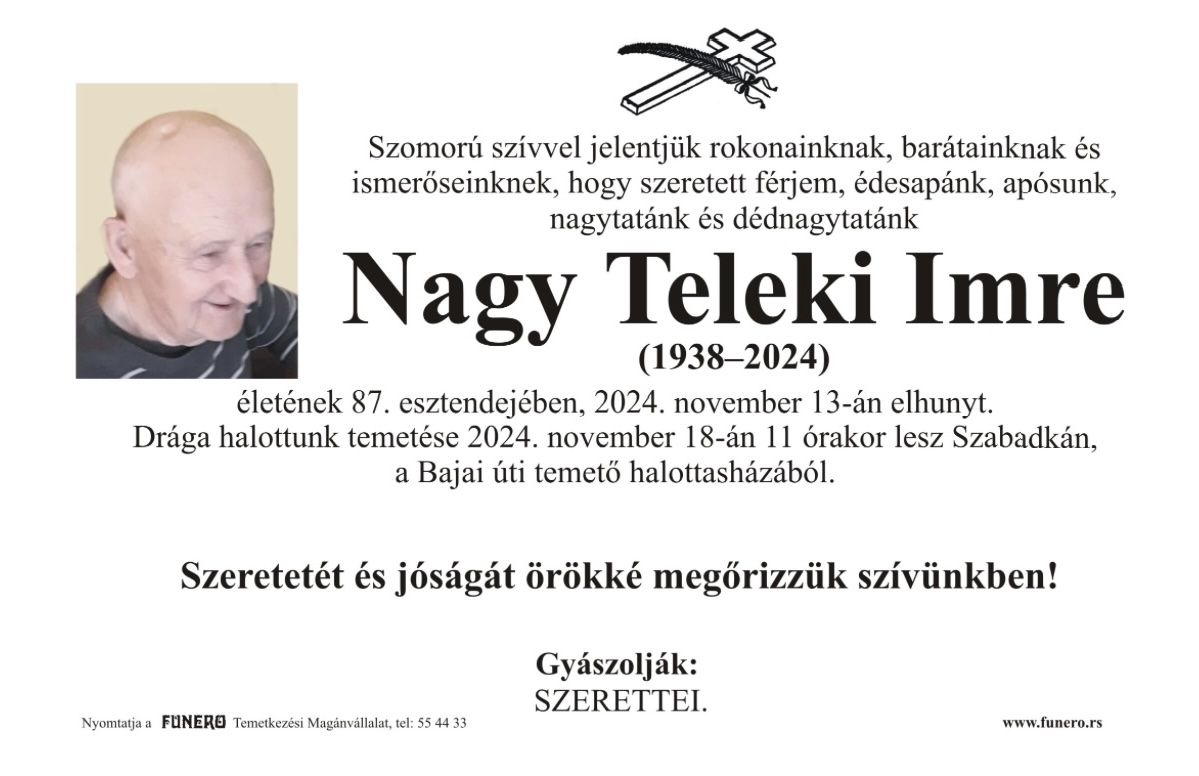 U 86. godini preminuo je Imre Nađ Teleki iz Subotice, iz Aleksinačke ulice. Sahrana je 18. novembra u 11 sati na Bajskom groblju iz mrtvačnice.