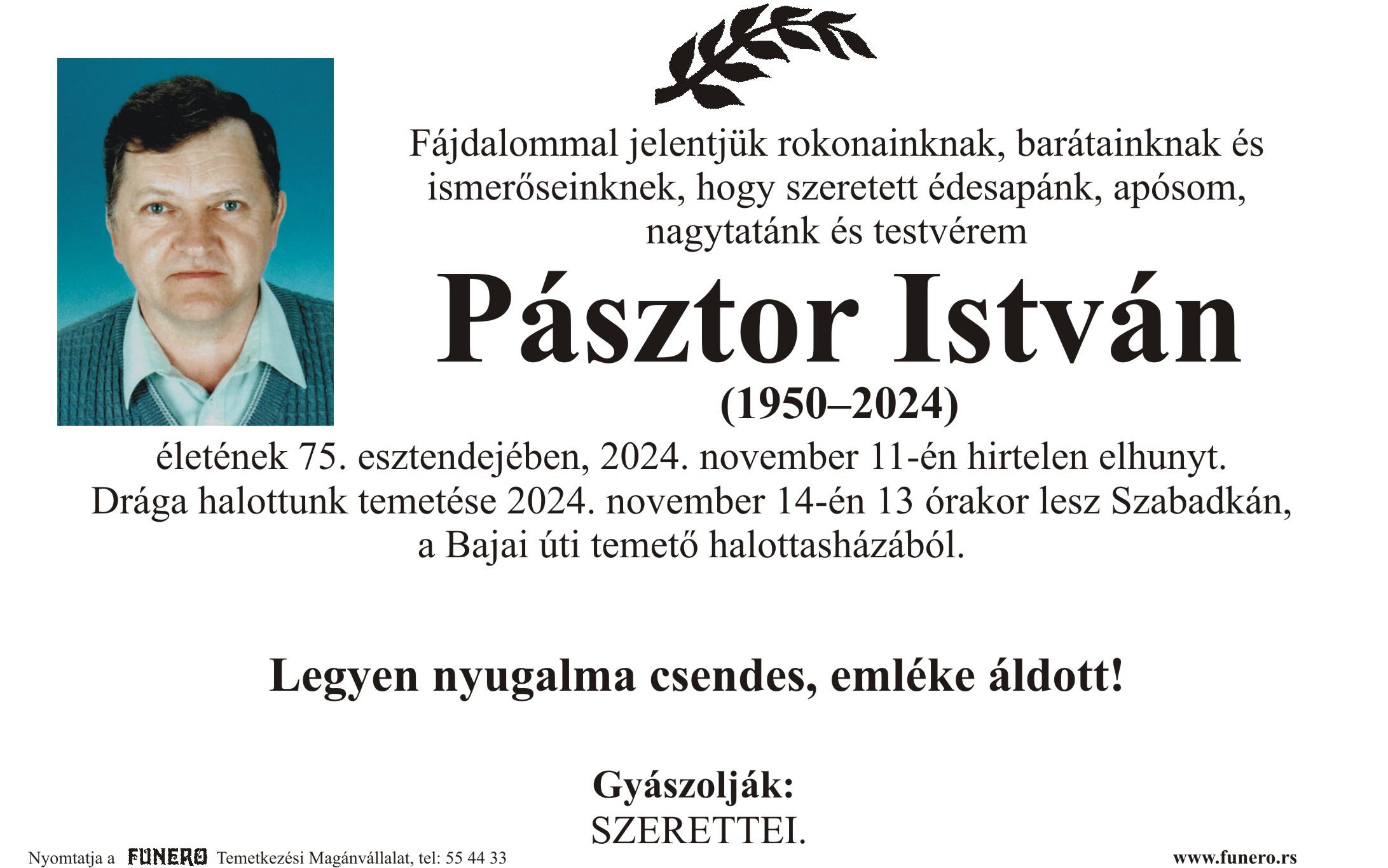 U 74. godini preminuo je Ištvan Pastor iz Subotice, iz ulice Miroslava Antića. Sahrana je 14. novembra u 13 sati na Bajskom groblju iz mrtvačnice.
