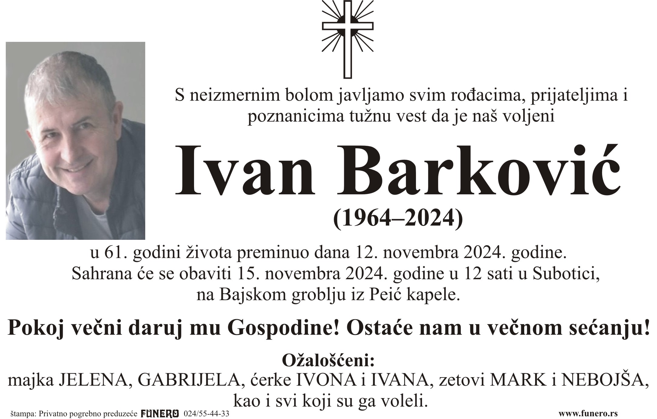 U 60. godini preminuo je Ivan Barković iz Subotice, iz Sunčane ulice. Sahrana je 15. novembra u 12 sati na Bajskom groblju iz Peić kapele.