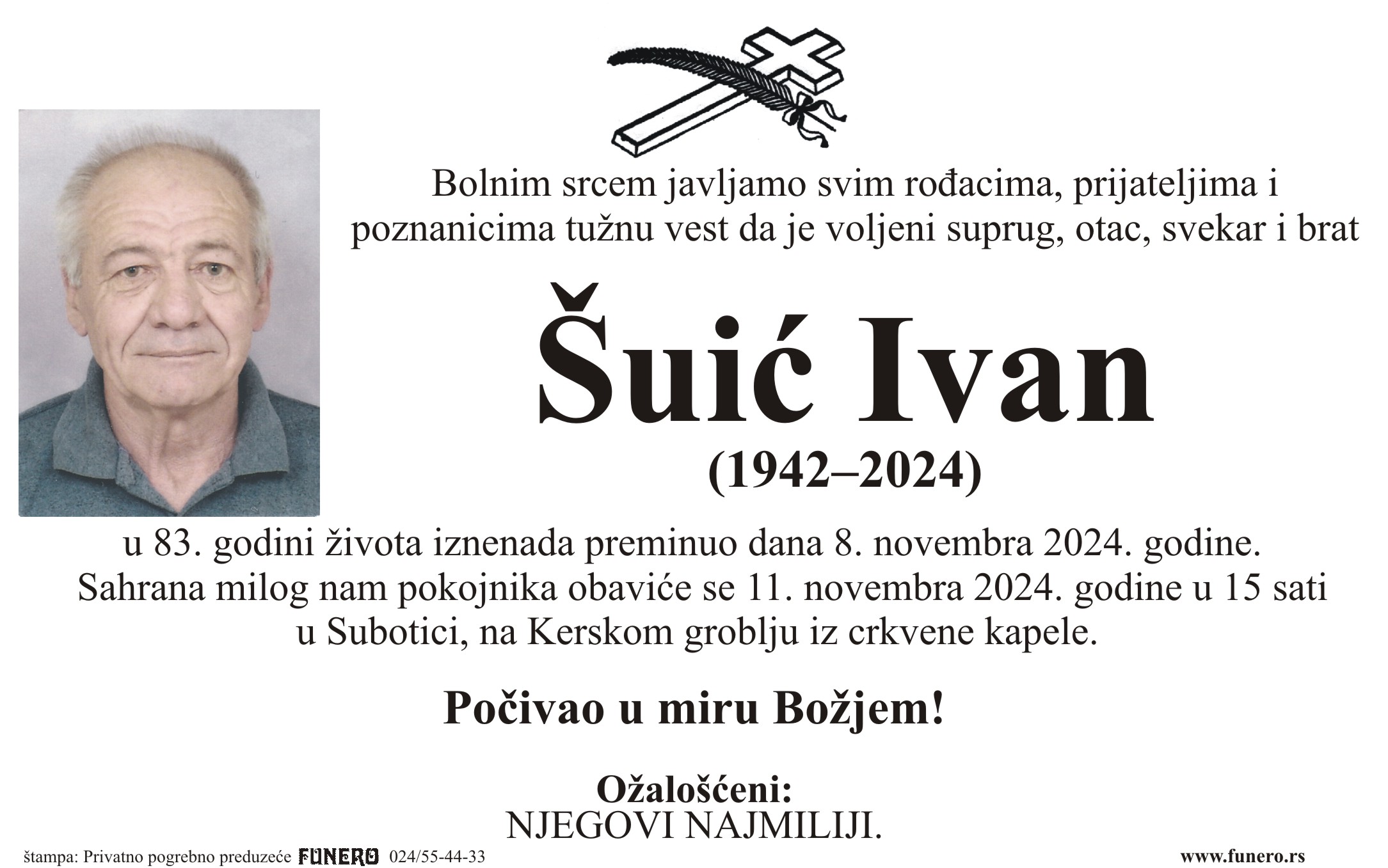 U 82. godini preminuo je Ivan Šuić iz Subotice, iz ulice Đure Stantića. Sahrana je 11. novembra u 15 sati na Kerskom groblju iz crkvene kapele.