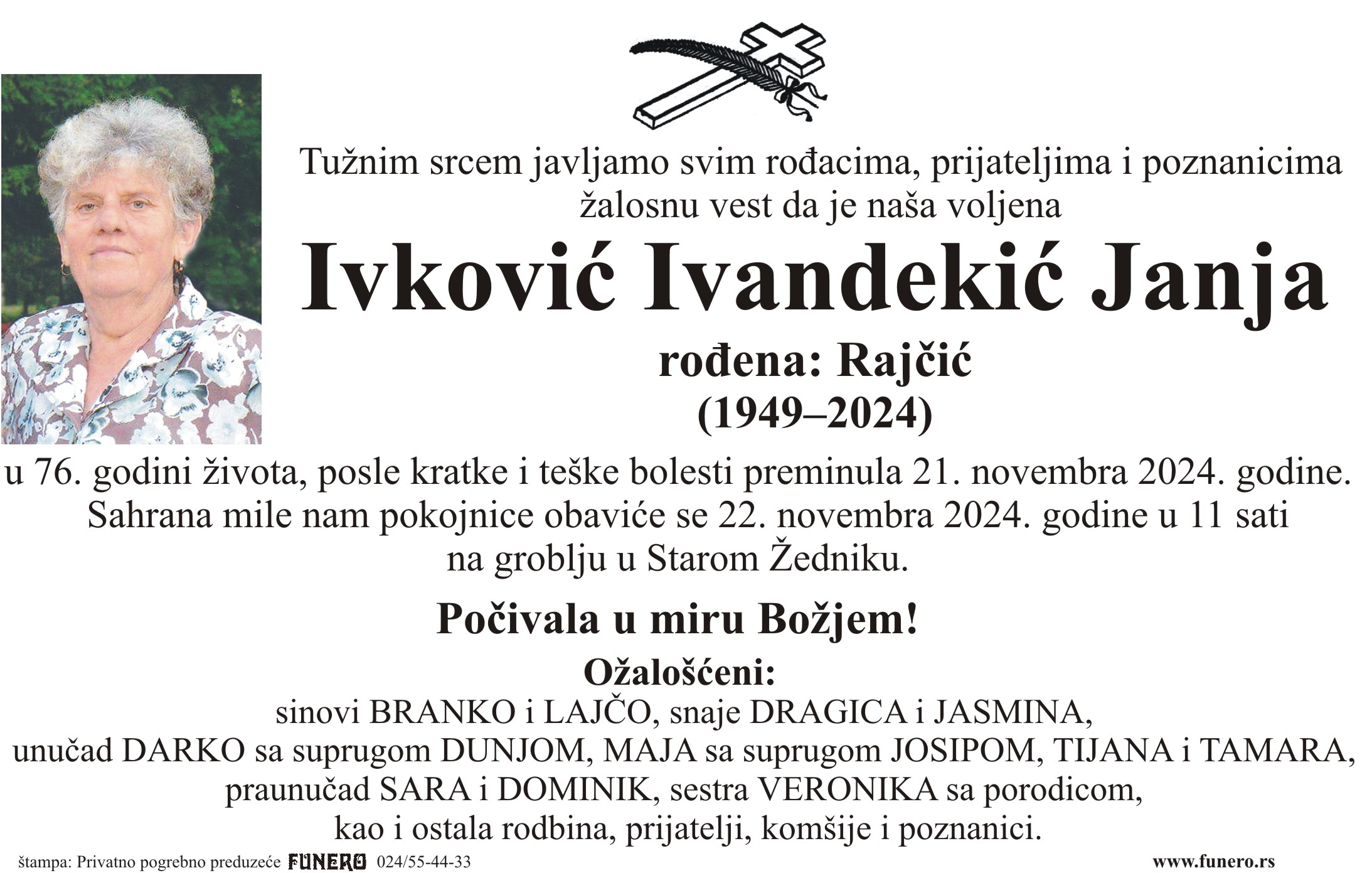 U 75. godini preminula je Janja Ivković Ivandekić iz Starog Žednika, iz ulice Maksima Gorkog. Sahrana je 22. novembra u 11 sati na groblju u Starom Žedniku.
