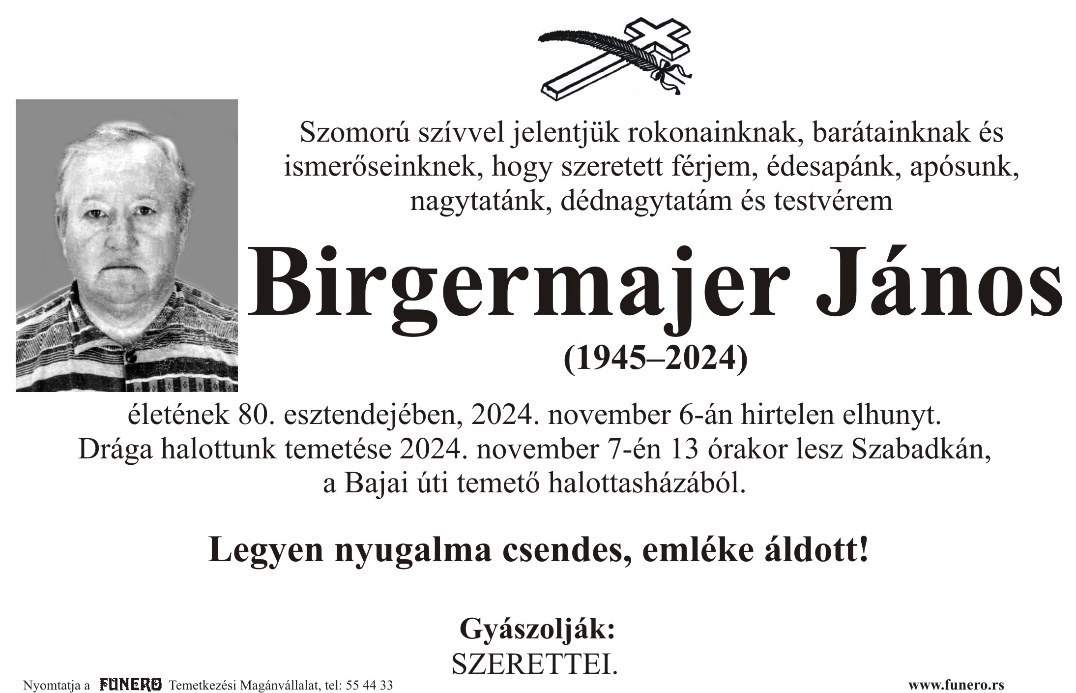 U 79. godini preminuo je Janoš Birgermajer iz Kelebije. Sahrana je 7. novembra u 13 sati na Bajskom groblju iz mrtvačnice.