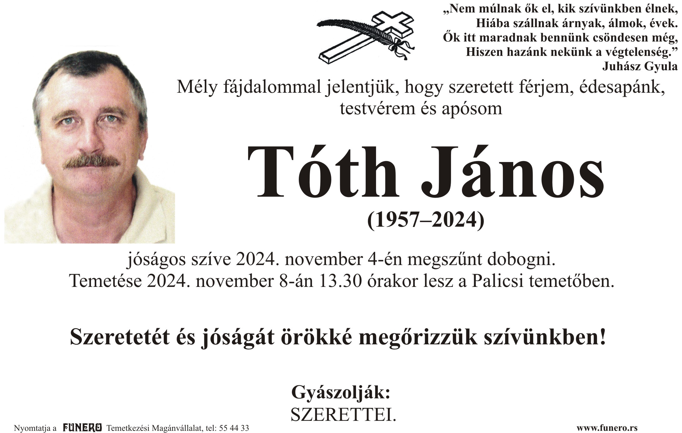 U 67. godini preminuo je Janoš Tot sa Palića, iz Sutjeske ulice. Sahrana je 8. novembra u 13 sati i 30 minuta na Palićkom groblju.