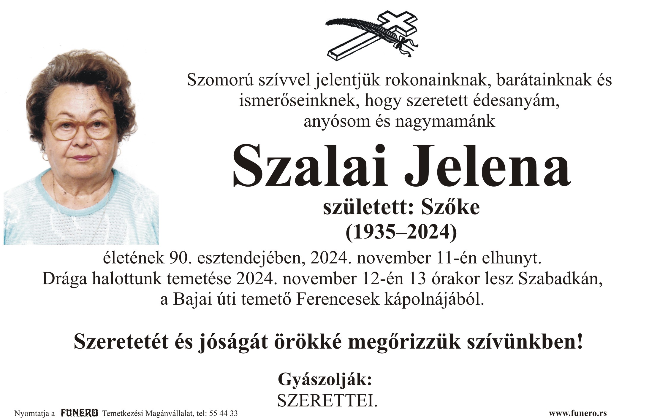 U 89. godini preminula je Jelena Salai iz Subotice, iz Peščarine ulice. Sahrana je 12. novembra u 13 sati na Bajskom groblju iz Franjevačke kapele.